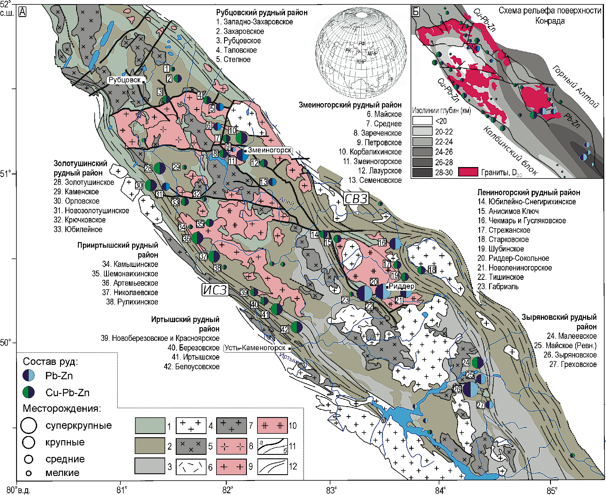 Фиг. 1. Схема размещения магматических комплексов Рудного Алтая, по (Куйбида и др., 2015) на основе (Геологическая…, 1956; Государственная…, 2000, 2001, с уточнениями), и позиция изученных месторождений. (А). 1 – складчатый фундамент (турбидитовый бассейн) Рудного Алтая, S-D1 ?; 2 – вулканический пояс Рудного Алтая, D1–3; 3 – континентальные отложения, С1; 4 – лениногорский, синюшинский и калбинский комплексы гранитоидов (объединенные), P1-T2; 5 – волчихинский и гилевский комплексы (кварцевые диориты, тоналиты, плагиограниты, гранодиориты), С2–3; 6 – сержихинская свита (долериты, андезиты, плагиодациты, дациты, риолиты) и сержихинский вулканический комплекс (массивы щелочных гранитов, гипабиссальные малые интрузии и дайки гранит-порфиров и диоритовых порфиритов), С3 -P1; 7 – прииртышский комплекс в Иртышской сдвиговой зоне (граниты, плагиограниты), D3 -C1; 8–10 – гранитоиды Рудного Алтая, D3 -С1 (8 – устьянский комплекс (лейкограниты), 9 – змеиногорский комплекс (габбро, габбронориты, габбродиориты, диориты, кварцевые диориты, плагиограниты, лейкоплагиограниты), 10 – алейский комплекс (плагиограниты)), D2; 11 – разломы картируемые (а) и предполагаемые (б); 12 – зоны смятия: Иртышская (ИЗС) и Северо-Восточная (СВЗ). (Б). Схема рельефа поверхности Конрада (Большой Алтай…, 1998).