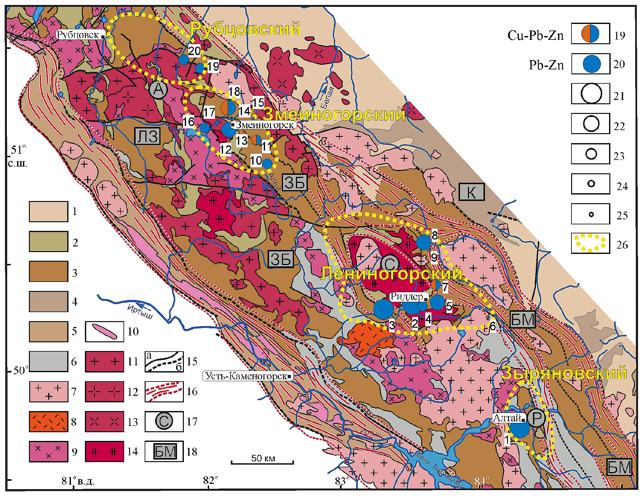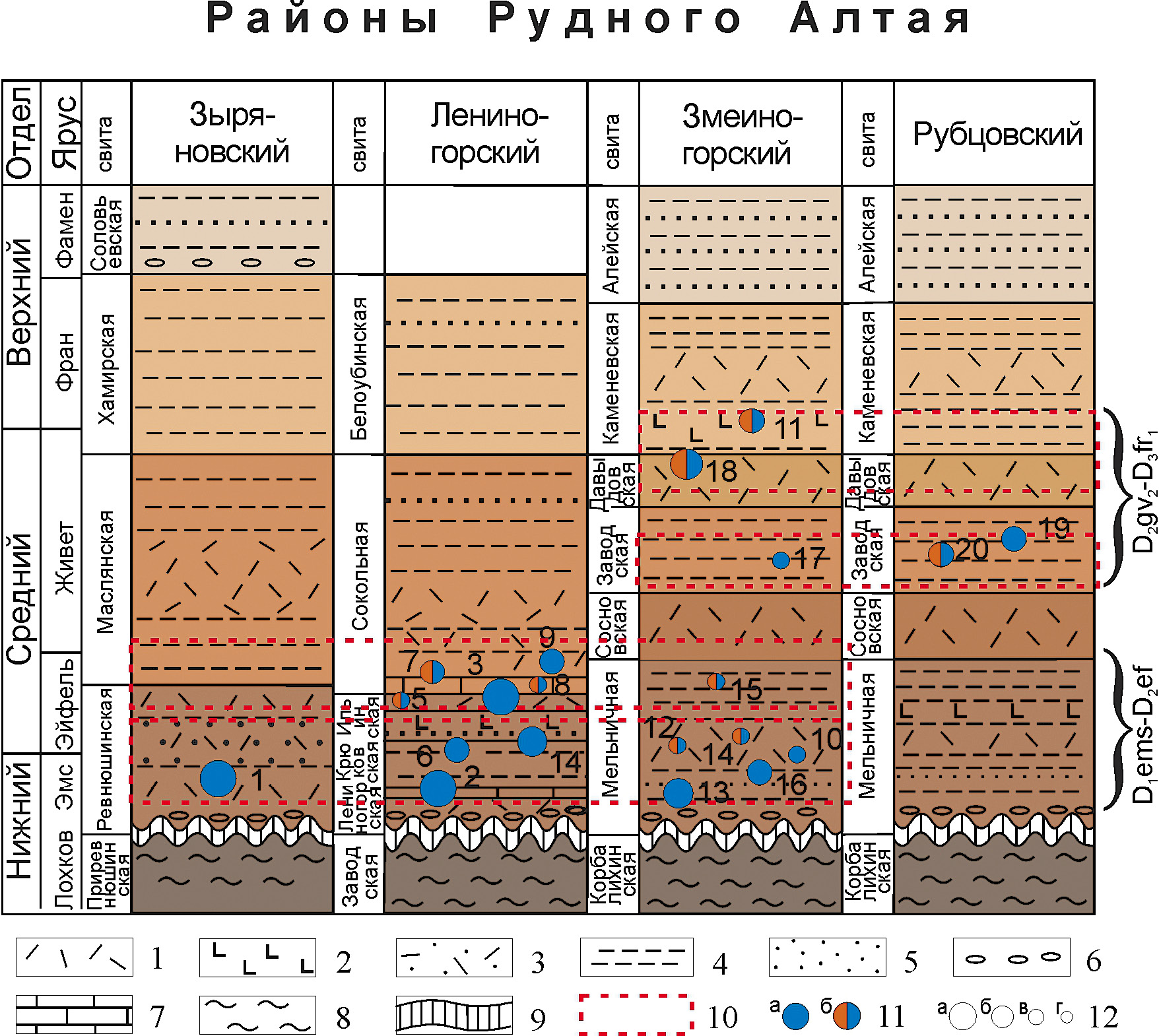 Змеиногорско-Зыряновская металлогеническая подзона отвечает восточному сегменту Рудноалтайской зоны. Наши ранние исследования, начатые в советские годы (1982 г.) и с перерывами продолжающиеся до настоящего времени, в основном проводились в центральном и южном секторах подзоны, отвечающих Лениногорскому и Зыряновскому рудным районам соответственно; основные результаты были обобщены в монографии (Викентьев, 2004). Здесь крупнейшие в регионе и при этом многочисленные колчеданно-полиметаллические месторождения приурочены к Синюшинскому и Ревнюшинскому поднятиям и сопряженному с первым Белоубинскому прогибу и связаны с образованиями базальт-риолитовой формации эмс-живетского возраста, в составе которой кислые эффузивы слагают 15‒45% от общего объема пород и до 70% объема вулканитов, а основные им подчинены (5–15% общего объема). В постсоветские годы больше внимания авторами было уделено российской части Рудного Алтая – его северо-западной части, включающей Золотушинский, Змеиногорский и Рубцовский рудные районы (Куйбида и др., 2013, 2015, 2019; Kuibida et al., 2020; Чернышев и др., 2023). Циклы рудоносного контрастного по составу вулканизма охватывают здесь более широкий возрастной диапазон – с начала эйфеля до конца франа.