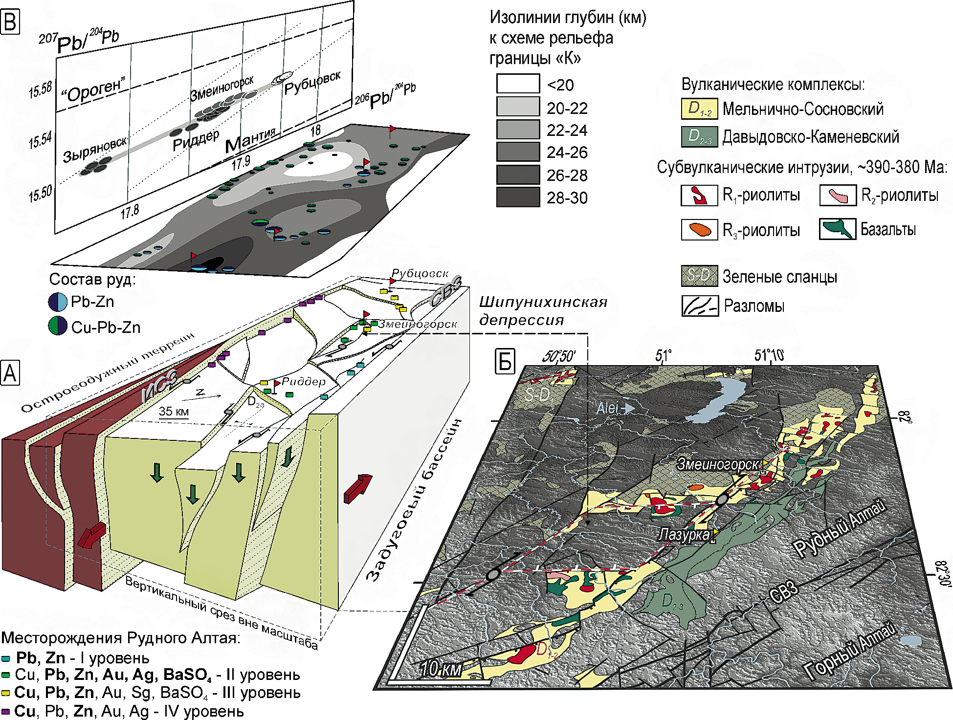 В тектоническом строении Рудноалтайского блока участвует каледонский фундамент, который имеет двухуровневое строение: в верхней части развита карбонатно-терригенная формация (S-D1), сформированная в период “пассивной” континентальной обстановки, а в основании – предполагаемая метабазитовая кора (Добрецов и др., 2004; Ota et al., 2007; Safonova et al., 2011; Врублевский и др., 2016). По нашим данным, основным источником сноса обломочного материала верхней коры Рудного Алтая могли являться вулканогенные породы, близкие к таковым океанических островных дуг среднекембрийского возраста, фрагменты которых были аккретированы к окраине Сибирского континента в раннем палеозое. Существование в составе блока докембрийской континентальной коры сомнительно, на основании данных об изотопном составе Nd в гранитоидах (Крук и др., 1999; Куйбида и др., 2013; Крук, 2015), свидетельствующих о резком преобладании здесь ювенильной коры, и данных палеонтологических исследований, указывающих только на позднесилурийско-раннедевонский (пржедолий-локховский) возраст осадков (Дубатолов и др., 1980; Кульков, 1980; Козлов, Дубатолов, 1994; Государственная…, 2000, 2001). В основании девонской вулканогенно-осадочной толщи обнаруживается стратиграфический перерыв и угловое несогласие с подстилающим фундаментом, обусловленные кратковременным поднятием территории на начальной (раннедевонской) стадии тектоно-магматической активизации (Большой Алтай…, 1998; Государственная…, 2001). Согласно диагностическим признакам, рассмотренным в обзорах (Ломизе, 2003; Turcotte, Schubert, 2014), это могло являться отражением начальной стадии субдукции – в момент пододвигания океанической плиты под континентальную.