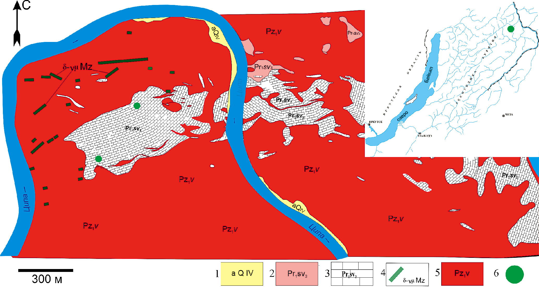 Фиг. 2. Геологическая карта Воймаканского месторождения по (Кодочигов, Курбатов, 2015ф) с дополнениями и исправлениями; 1 – аллювиальные отложения; 2 – верхняя подсвита суванихинской свиты: сланцы, гнейсы, амфиболиты, известняки, метаэффузивы; 3 – средняя подсвита суванихинской свиты: известняки, доломиты, сланцы; 4 – мезозойские интрузивы: габбро, диориты, габбро-диориты; 5 – Витимканский интрузивный комплекс: граниты, гранодиориты, диориты, аплиты, пегматиты; 6 – залежи нефрита вне масштаба.