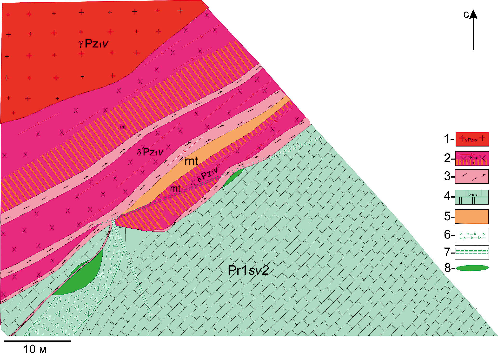 Фиг. 3. Геологическая схема залежи нефрита № 1 (первый и второй блоки) на контакте мраморизованных доломитов и амфиболитов по (Кодочигов, Курбатов, 2015ф) с дополнениями и исправлениями. Витимканский интрузивный комплекс: 1 – первая фаза, 2 – вторая фаза, 3 – верхняя подсвита суванихинской свиты, 4 – средняя подсвита суванихинской свиты, 5 – метасоматически измененные породы, 6 – тектонические брекчии, 7 – зоны разрывных нарушений, 8 – тела кальцит-тремолитовых скарнов с желваками и жилами нефрита.
