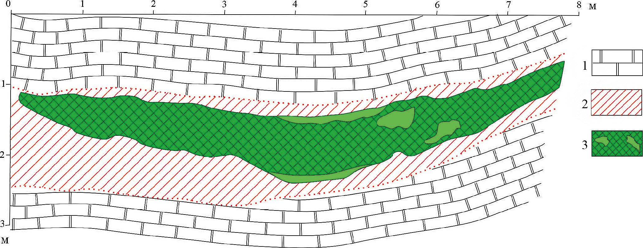 Фиг. 4. Зарисовка разреза третьего блока 1 залежи – расчистка в западной стенке карьера (Кодочигов, Курбатов, 2015ф) с дополнениями и исправлениями: 1 – доломитовый мрамор эпидотизированный, 2 – эпидот-тремолитовый скарн, 3 – кальцит-тремолитовый скарн с желваками и прожилками нефрита.