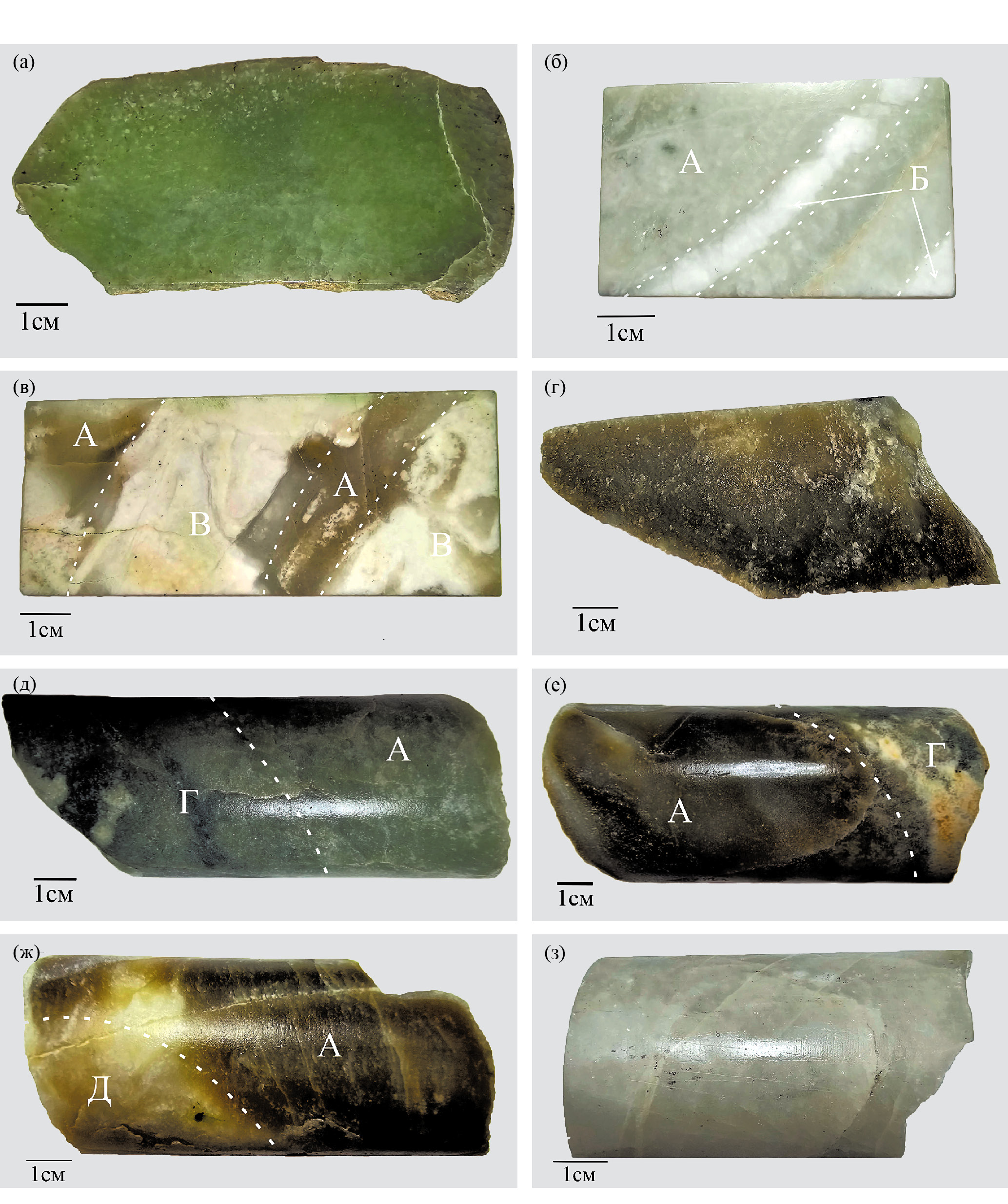 Фиг. 5. Цветовые вариации нефрита Воймаканского месторождения: а – салатный V1-14; б – светло-салатный (А) с обособлениями кальцит-тремолитового агрегата (Б) PK 5-4-1; в – диопсидит (В) с серо-салатным нефритом (А) KP 57-1-12; г – бурый (медовый) PK 3; д – контакт эпидот-тремолитового скарна (Г) со светло-зеленым нефритом (А) KP 5-3-1; е – контакт эпидот-тремолитового скарна (Г) с коричневым (медовым) нефритом (А) PK 3; ж – контакт кальцит-тремолитового скарна (Д) с коричневым (медовым) нефритом (А) PK 4; з – доломит KP 81-1-3.