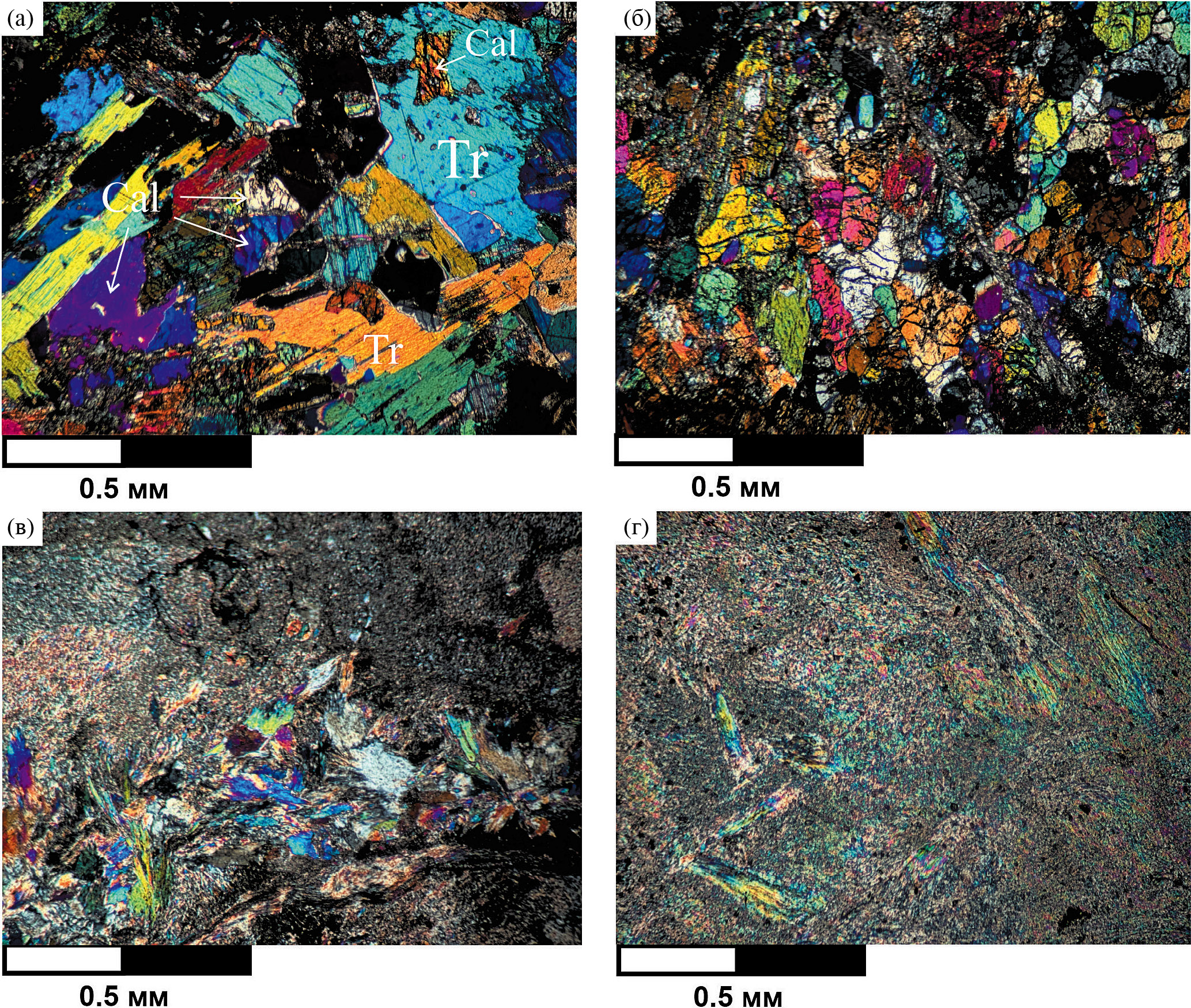 Фиг. 6. Микрофотографии образцов: а – лейсты тремолита Tr и мелкие зерна кальцита Cal в кальцит-тремолитовом скарне KP 6-1-3; б – гипидиоморфные зерна тремолита в эпидот-тремолитовом скарне PK-3; в – прожилок изометричного до игольчатого позднего тремолита сечет скрытокристаллический спутанно-волокнистый агрегат тремолита нефрита KP 5-3-7; г – скрытокристаллический спутанно-волокнистый агрегат тремолита нефрита KP 5-3-7.