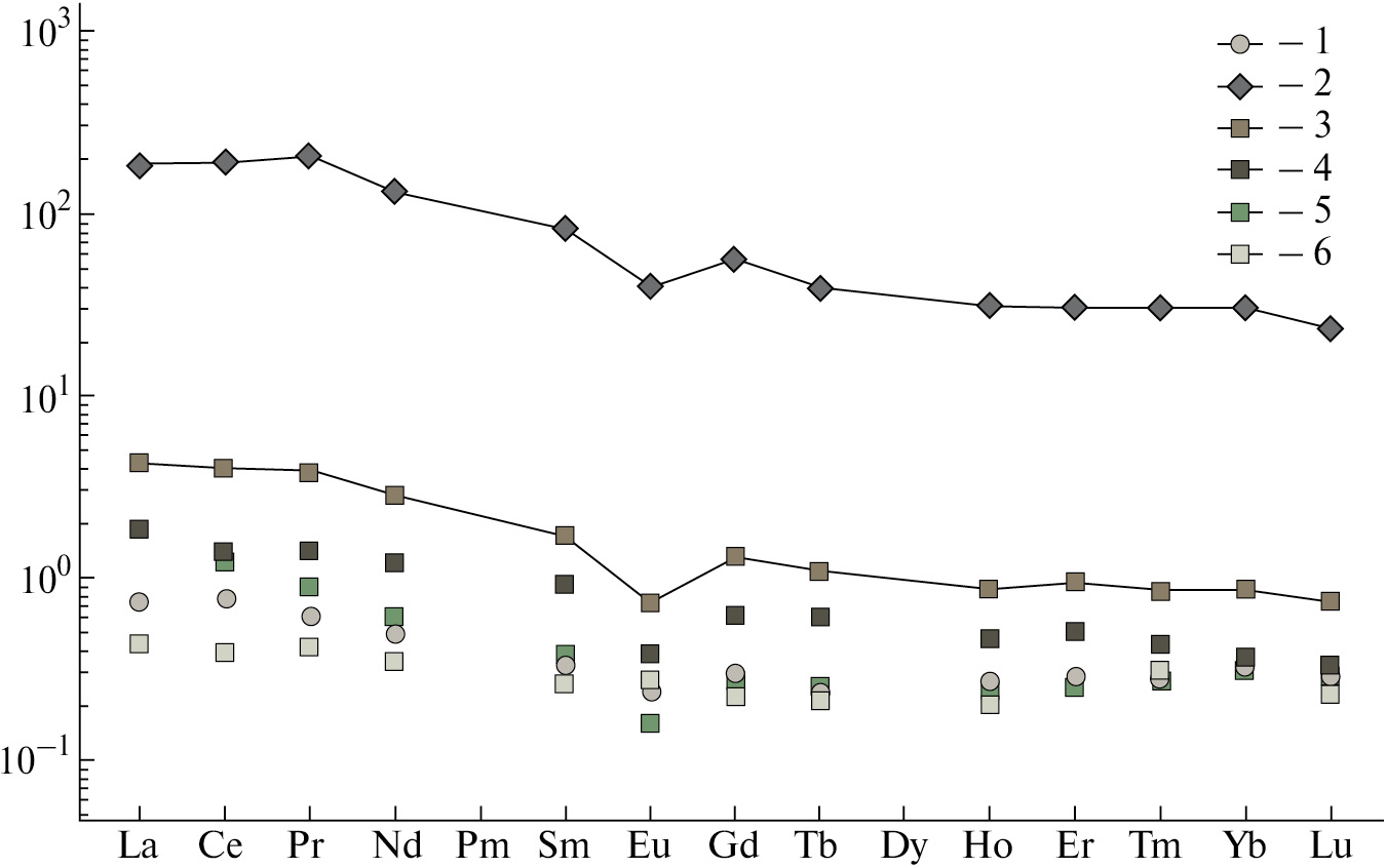 Содержания микроэлементов определены в ЦКП “Геоаналитик” (ИГГ УрО РАН) на квадрупольном ИСП масс-спектрометре NexION300S (Perkin Elmer, США). Микроволновое разложение проб осуществлялось смесью кислот HCl + HNO3 + HF c использованием системы Berghof Speedwave MWS 3+. Операционные условия масс-спектрометра: мощность радиочастотного генератора – 1300 Вт, материал конусов – платина. Все измерения проводились в режиме количественного анализа с построением градуировочных кривых. Для построения градуировочных зависимостей использовались сертифицированные в соответствии ISO 9001 мультиэлементные стандартные растворы (Perkin Elmer Instruments). Для контроля использованы сертифицированные образцы базальта BCR-2 и андезита AGV-2 (USGS). В течение анализа серии проб измерение стандартного образца проводилось с периодичностью 1:5–1:10. Полученные концентрации редких, рассеянных и редкоземельных элементов удовлетворительно согласуются с аттестованными величинами с допустимым отклонением в пределах 15%. Погрешности определения элементов составили (отн. %): 24 (Cr, Ni, Co, Cu, V, Ba, Sr), 30 (Rb), 41 (РЗЭ), 50 (Zr), 60 (Y, Hf, Ta, Nb, Th, U). Аналитик Д.В. Киселева.