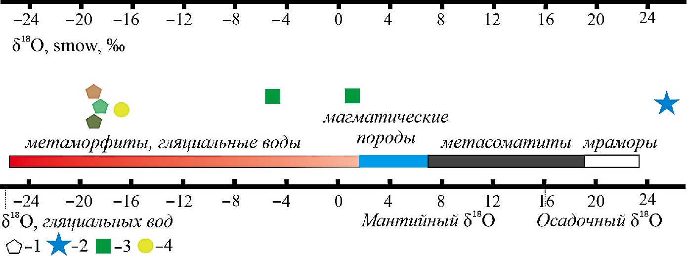 В работе (Gao et al., 2020), используя ранее полученные данные по изотопному составу кислорода нефрита Витимской провинции (Бурцева и др., 2015 1, 2 ), были проведены расчеты изотопного состава кислорода во флюиде, равновесном при температуре 350 ° С по уравнению для тремолита. Для нефрита Витимской провинции получен изотопный состав флюида –19‰ δ18O. Если считать основным источником флюида метеорные воды, то они, имеющие по современным измерениям состав –16 ÷ –14‰ δ18O, явно не достигают значений гипотетического флюида.