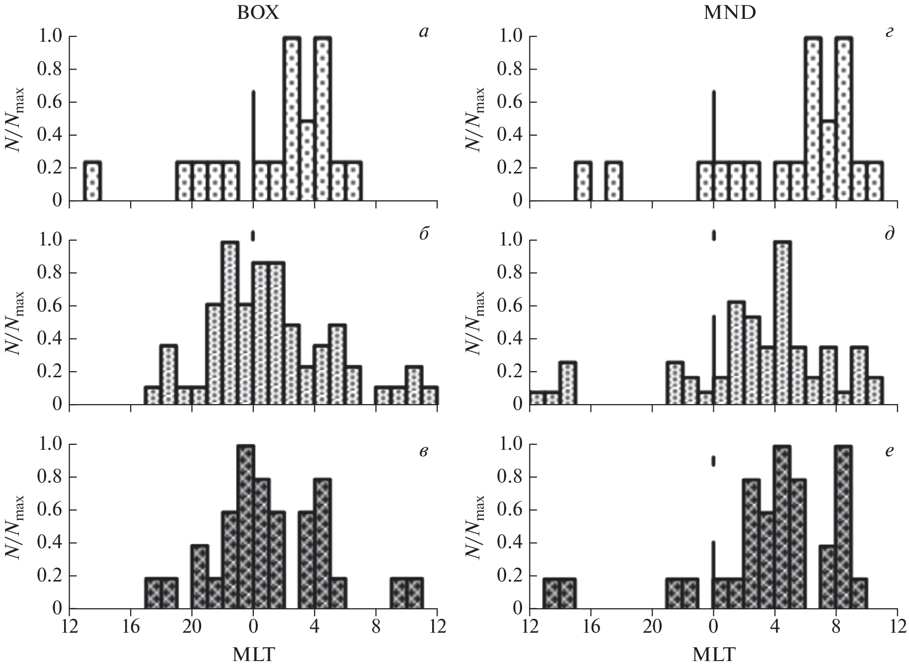 (BOX, Φ' = 53.6°; Λ' = 114.4°; L = 2.8) and Mondy (MND, Φ' = 47°; Λ' = 174°; L = 2.1) for the
