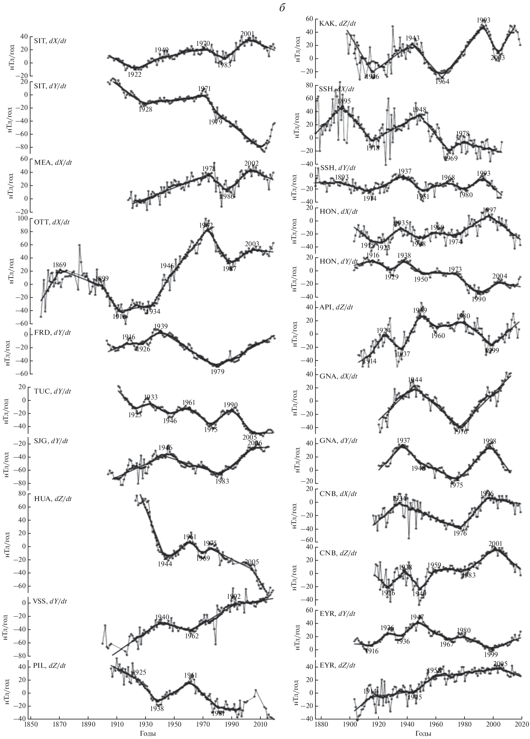 - − Brown W.J, Mound J.E., Livermore P.W. Jerks abound: An analysis of geomagnetic observatory data from 1957 to 2008 // Phys. Earth Planet. Inter. V.223. P. 62–76. 2013.