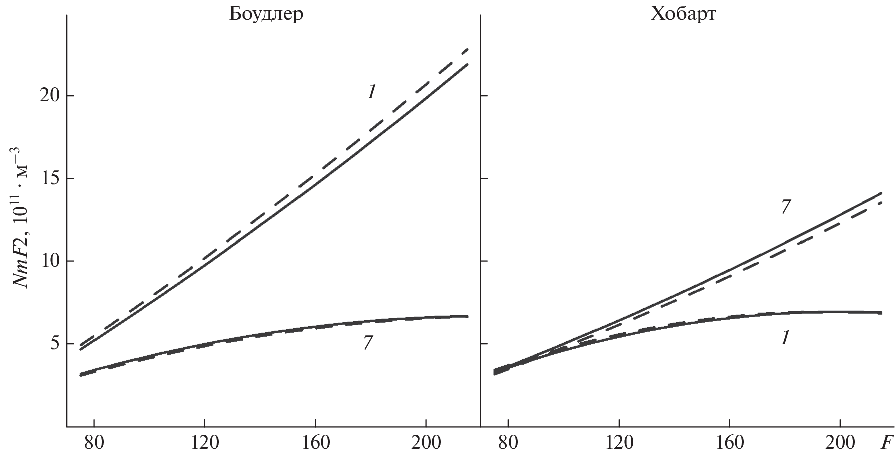 NmF2 concentration for this pair of stations. Solar activity indices averaged over 81 days are used: Fobs is