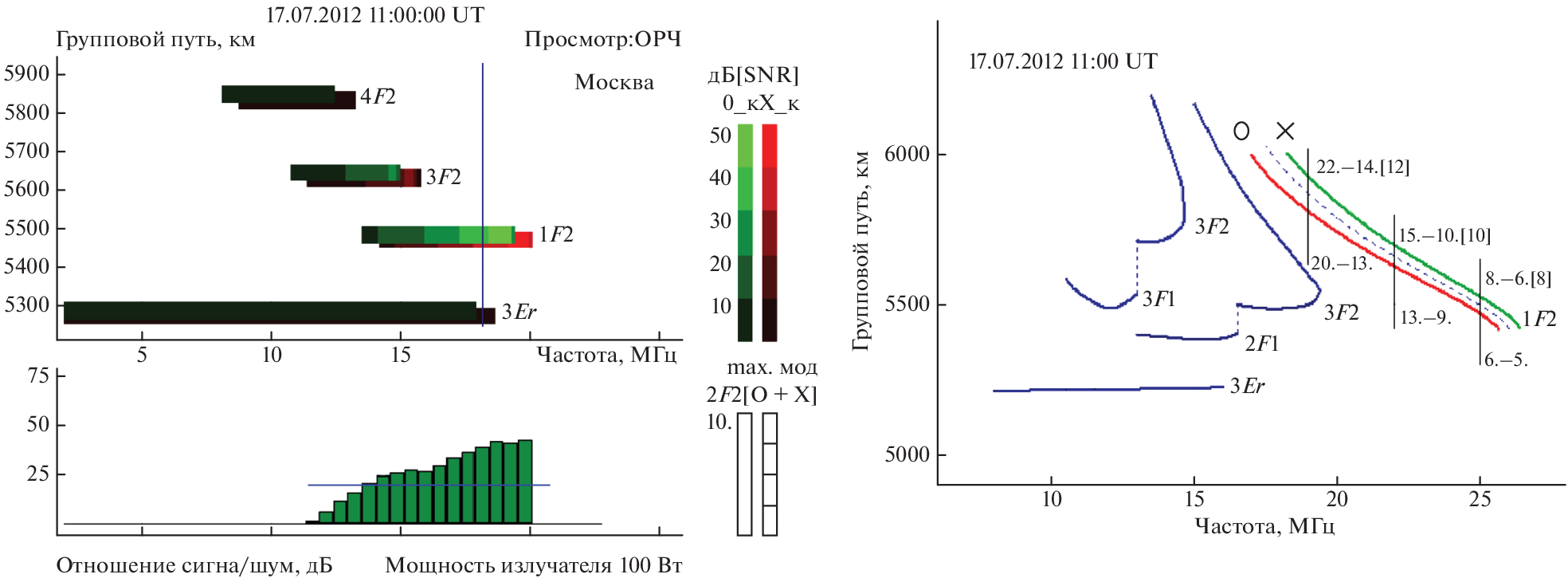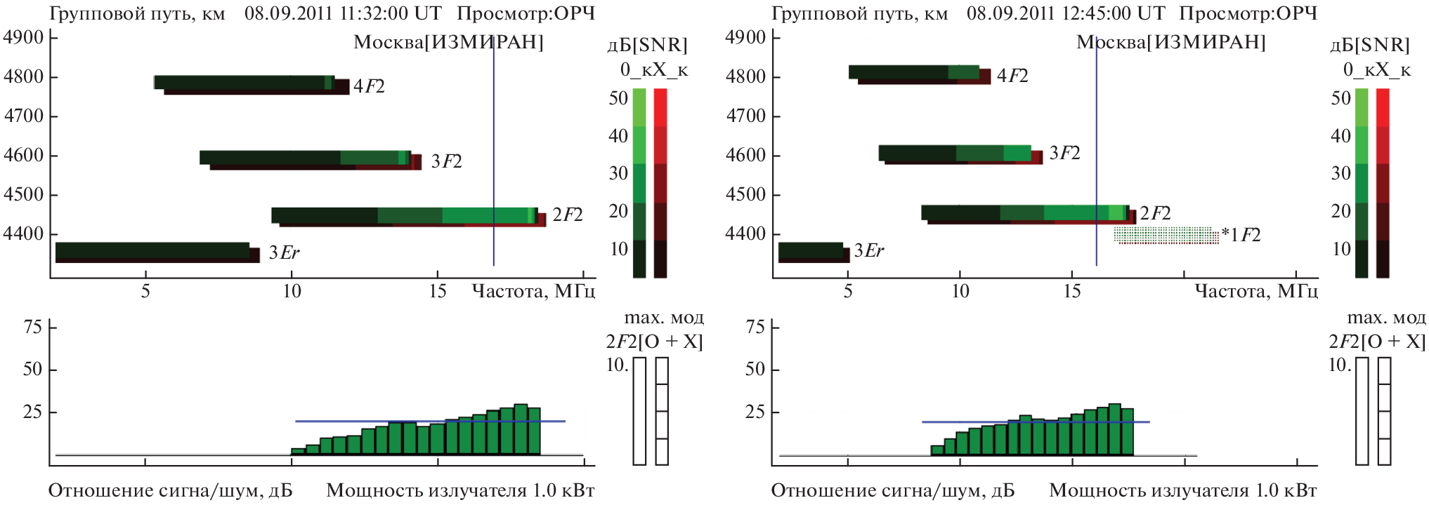 example of two meridional radio links: single-hop (~2600 km) and dominant two-hop (~5100 km) for basic