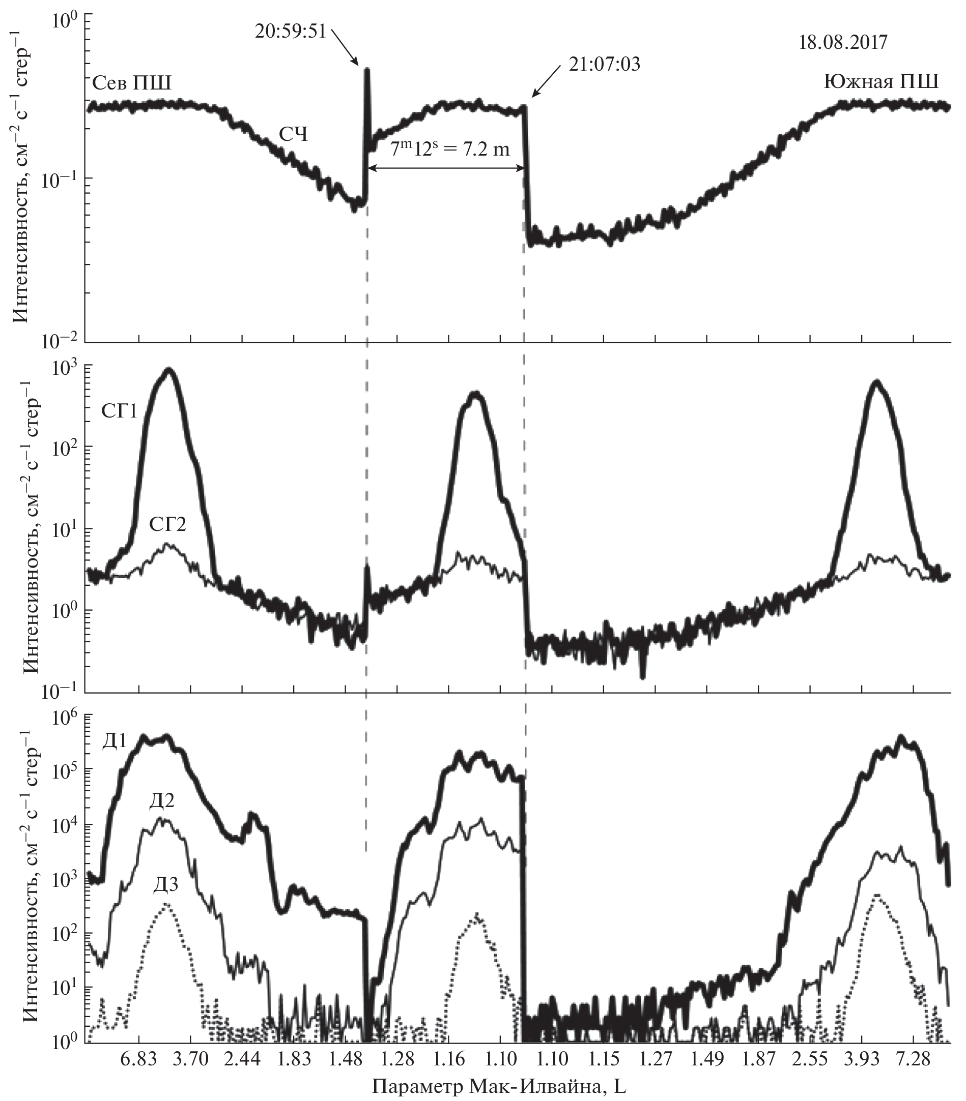 - − Suvorova A.V., Dmitriev A.V., Parkhomov V.A. Energetic electron enhancements under the radiation belt (L < 1.2) during a non-storm interval on 1 August 2008 // Annales Geophysicae. V. 37. P. 1223–1241. 2019. https://doi.org/10.5194/angeo-37-1223-2019