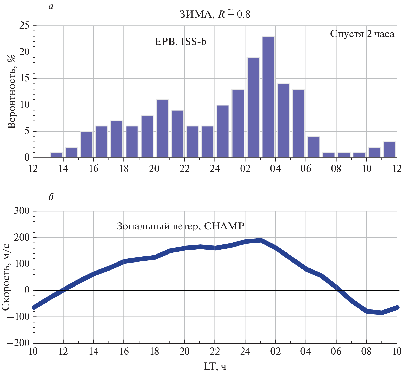There are a number of the theoretical studies pointing to the key role of the zonal thermosphere winds in the equatorial plasma bubble (EPB) generation and evolution. However, there are insufficient observational data to confirm the relationship between these phenomena. To study this relationship, the detailed comparative and correlation analysis of the LT-variations of the EPB occurrence probability and the zonal thermosphere wind velocity was carried out. The data from the EPB observations recorded aboard the ISS-b satellite (~972–1220 km) during the solstice and equinox periods were used. The data from the zonal thermosphere wind velocity observations obtained aboard the CHAMP satellite (~380–450 km) were also used. It was found that these characteristics are similar, when they are compared, and have very strong correlation (R 0.9) in summer, strong correlation (R 0.8) in winter and (R 0.79) at equinox. It was found that in all seasons the delay in the development of the EPB occurrence probability maxima with respect to the maxima of the west wind velocity is 1–3 h. It is in good agreement with the estimation of the time of the seeding perturbation development and the EPB rise to the topside ionosphere altitudes. The results can be considered a new confirmation of the theoretical conclusion (Kudeki model) about the key influence of the zonal west thermosphere winds on the equatorial plasma bubble generation.