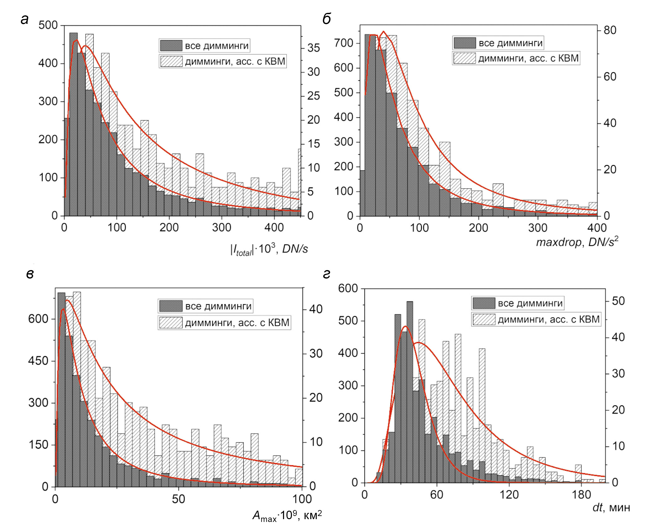 Почти для всех логнормально распределенных параметров значения максимумов распределения для диммингов, соотнесенных с КВМ, сдвинуты в сторону боʹльших абсолютных значений, чем для всей выборки за эти же годы (рис. 2). Пик распределения продолжительности димминга находится на значении 31.5 ± 0.5 мин для всей выборки и 44.7 ± 0.6 мин для диммингов, связанных с КВМ. В среднем КВМ соответствуют более мощным диммингам по совокупности всех параметров.