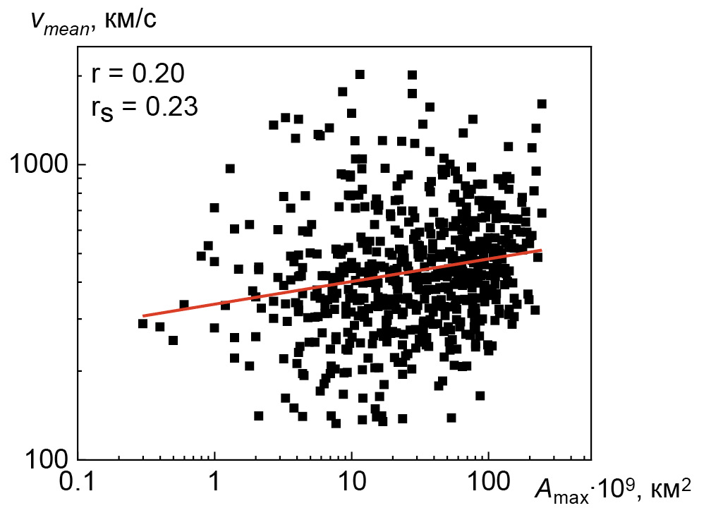 Рис. 5. Зависимость средней скорости КВМ в коронографе от максимальной площади димминга для всех соответствующих КВМ и диммингов. Прямая обозначает линейную зависимость логарифмов параметров.
