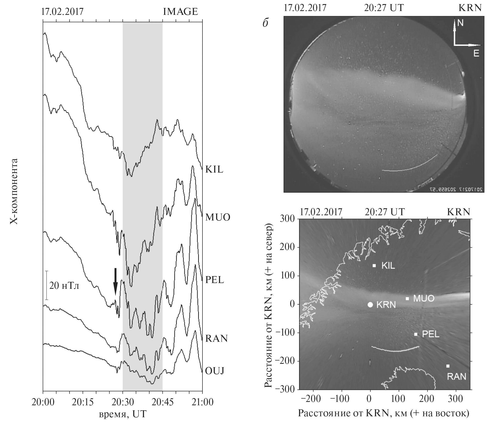 В момент времени ~20:12 UT находящаяся у самого северного края поля зрения камеры KRN дуга начала смещаться к югу. Момент начала движения точно определить не удалось, так как дуга располагалась у самого горизонта поля зрения. Тем не менее движение отслеживается по кеограмме и по серии кадров на рис. 1б. Такой характер поведения дуги является типичным для подготовительной фазы суббури. За несколько минут до появления авроральных вихрей дуга остановилась недалеко от зенита KRN, яркость в ней увеличилась (правый кадр на рис. 1б). Момент уярчения обозначен на магнитограммах как Т0. Сравнение с предшествующим кадром показывает, что уярчение дуги произошло не одновременно по всей ее длине, а распространялось с востока на запад и было обусловлено, вероятно, началом обычной суббури к востоку от области оптических наблюдений. На кеограмме на рис. 1б видно, что яркость свечения увеличилась не только в дуге, но и к экватору от нее, в области пульсирующего и диффузного свечения.