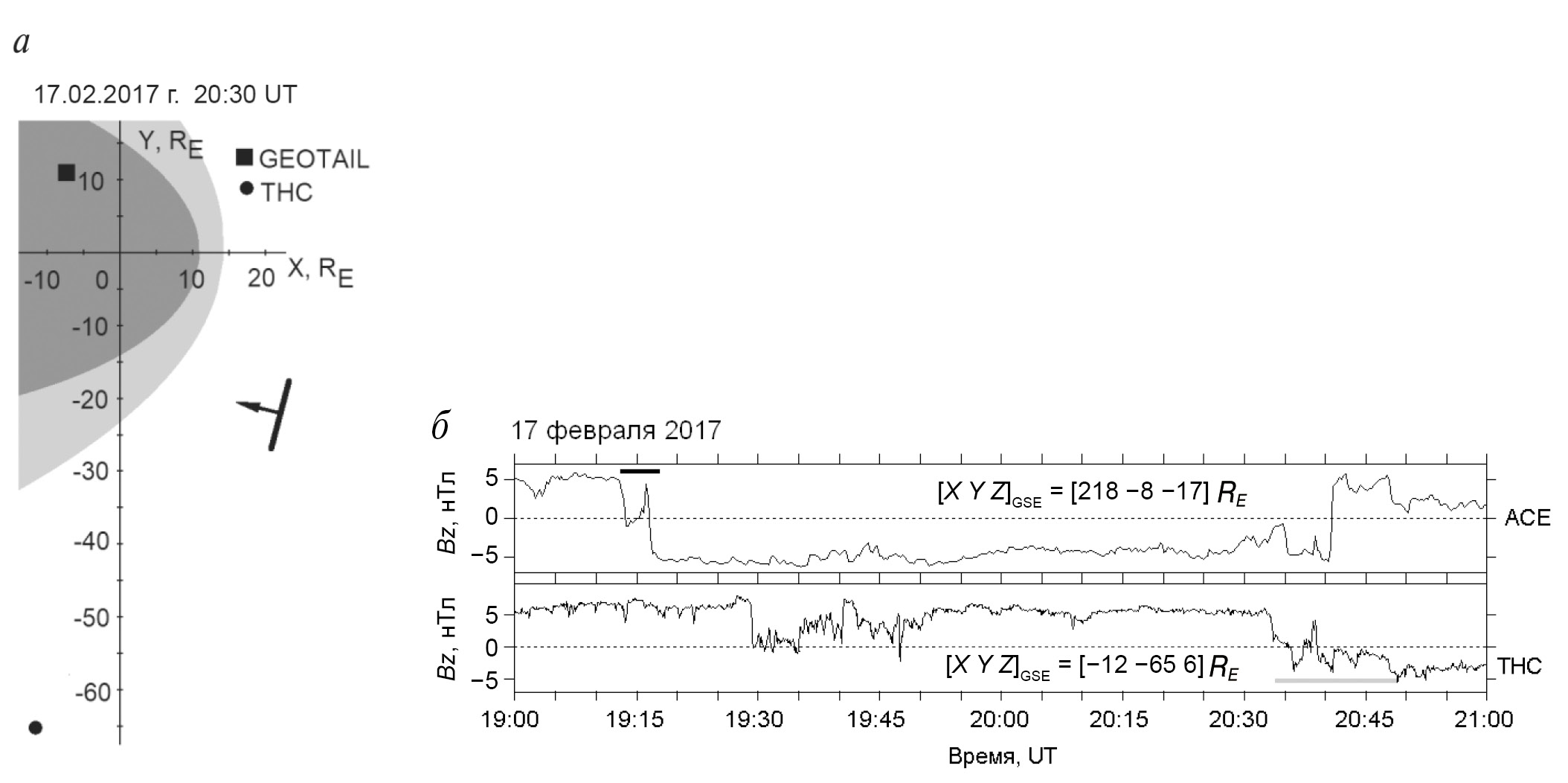 В работе использовались данные трех спутников в солнечном ветре (ACE, DSCOVR и THC) и спутника GEOTAIL, находящегося в вечерней части магнитосферы. Положение ближних к Земле спутников схематично представлено на рис. 5а. Отрезком прямой со стрелкой показан фронт неоднородности, ориентация которого определена по запаздыванию возмущения на спутниках ACE ([218 -8 -17] RE) и DSCOVR ([242 -14 -23] RE) и их взаимным расположением.