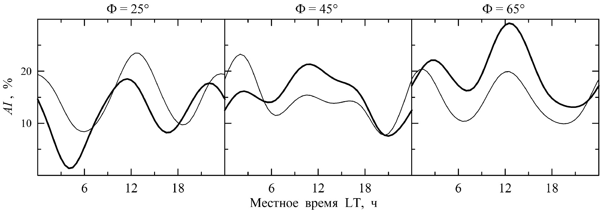 Рис. 4. Суточные вариации локального индекса AI(Φ) на исправленных геомагнитных широтах Φ = 25°, 45° и 65° для низкой (F = 80, тонкие линии) и высокой (F = 160, толстые линии) солнечной активности по модели SDMF2.