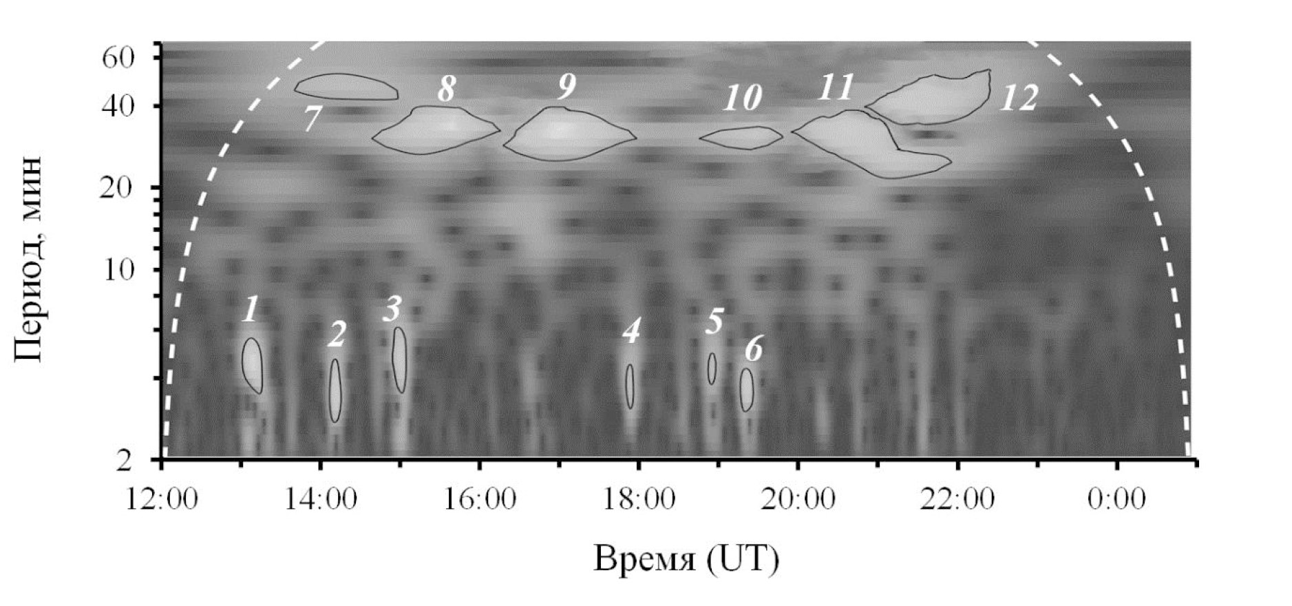 Практически такая же картина наблюдается в скалограмме (рис. 2), вычисленной по данным более удаленной ст. Магадан. В геомагнитных вариациях на ст. Магадан возникают аномалии через ~9‒10 мин после шести эпизодов повышенной активности вулкана Шивелуч в 12:54, 14:00, 15:20, 17:44, 18:46, 19:14 UT. Соответствующие аномалии имеют следующие периоды: аномалия 1 ‒ 3.5−6.0 мин, аномалия 2 ‒ 2.5−4.5 мин, аномалия 3 ‒ 3.5−6.0 мин, аномалия 4 ‒ 3−5 мин, аномалия 5 ‒ 3.5−5.0 мин, аномалия 6 ‒ 3−4 мин. Также в скалограмме, представленной на рис. 2, присутствуют аномалии, возникающие примерно через 40‒50 мин после шести эпизодов повышенной активности вулкана Шивелуч 10 апреля 2023 г. Соответствующие аномалии имеют следующие периоды: аномалия 7 ‒ 38−50 мин, аномалия 8 ‒ 27−39 мин, аномалия 9 ‒ 25−40 мин, аномалия 10 ‒ 29−37 мин, аномалия 11 ‒ 20− 39 мин, аномалия 12 ‒ 36−52 мин.