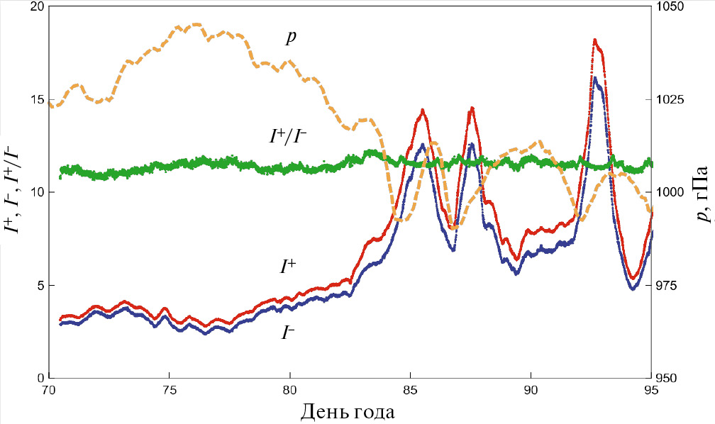 Пример измерения концентрации положительных и отрицательных ионов, а также отношения их концентраций в сравнении с атмосферным давлением представлен на рис. 1 для периода 12 марта — 6 апреля 2022 г. Измерения концентрации ионов производились каждые 4 с, на графике приведены данные, усредненные по интервалам 400 с. На рис. 1 хорошо видна антикорреляция хода концентраций ионов и атмосферного давления, поэтому целесообразным представляется провести корреляционный анализ всего набора данных. В нашем случае имеются данные за период февраль — сентябрь 2022 г.