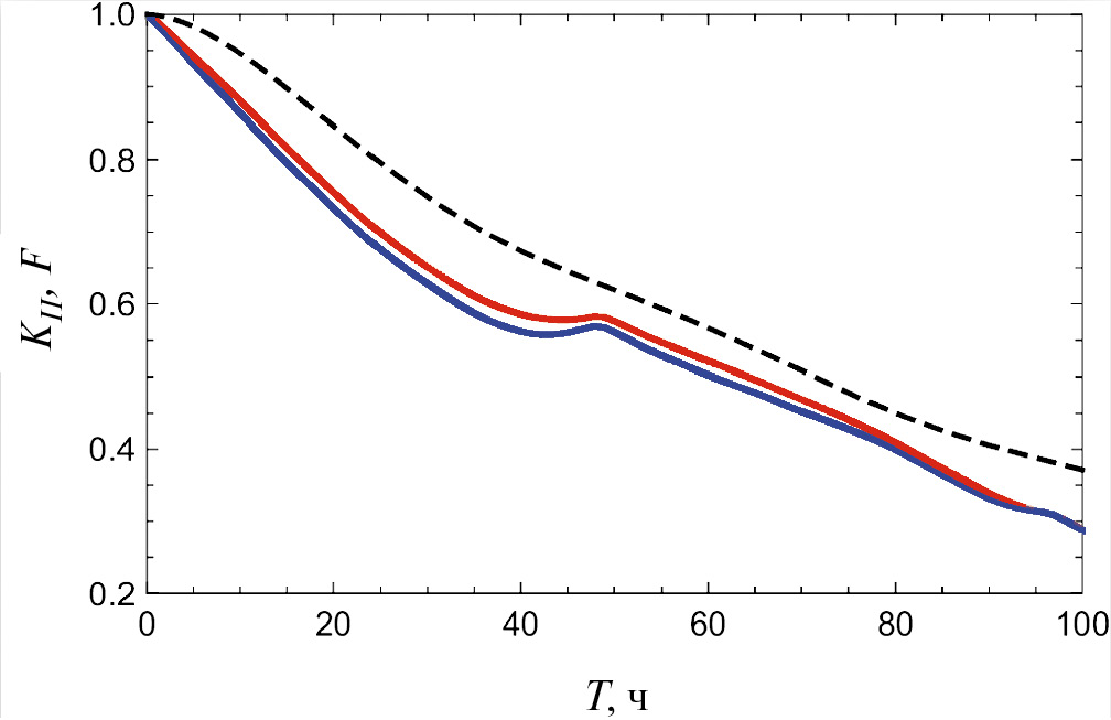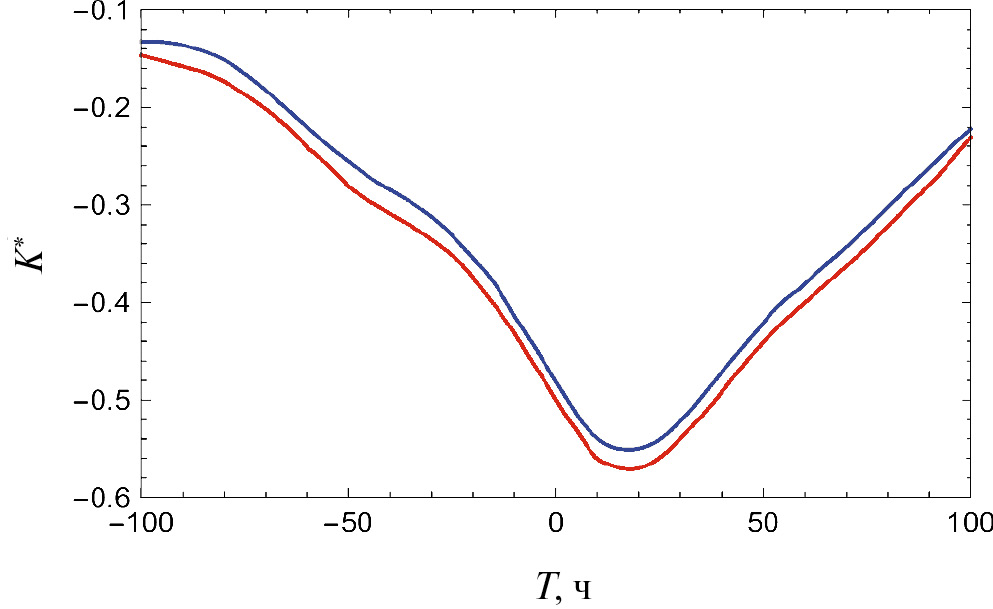 Использование решения (14) в численном расчете корреляционной функции (2) показывает (см. рис. 3), что результат для модели (13) мало отличается от результата расчета в рамках модели (7). В обоих случаях имеется максимальная антикорреляция при T ∼ 2 сут. При других T корреляционые кривые близки между собой по форме, но во второй модели нормировочный коэффициент на 19% больше, т.е. меньше влияние случайных помех в измерениях.