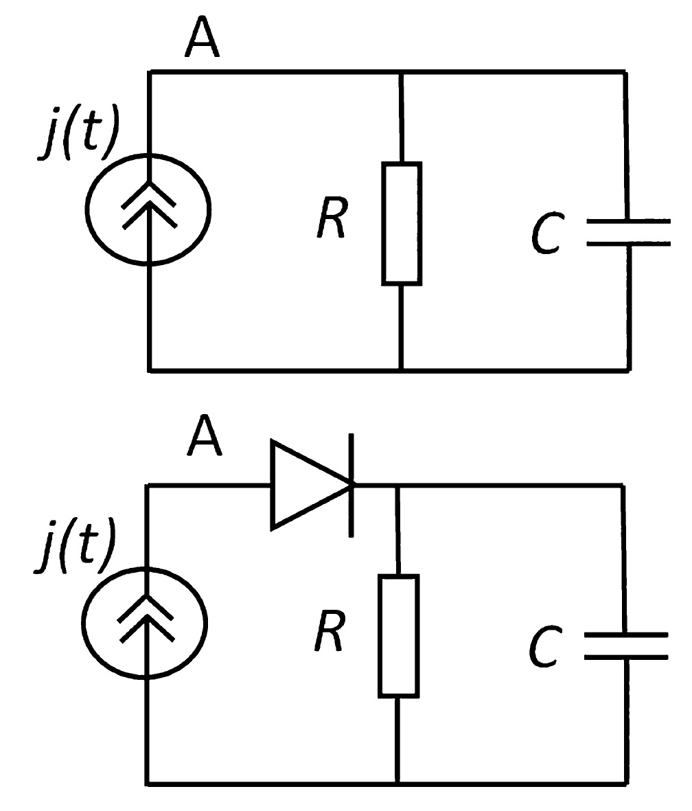 В случае модели II эквивалентная электрическая схема показана на рис. 4 снизу. Здесь отсутствует постоянный поток радона, поэтому j0 = 0. Радон поступает в помещение только при уменьшении давления ниже среднего давления , и поток радона практически нулевой при p > . Это свойство реализуется включением в схему на рис. 4 диода.