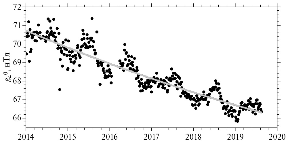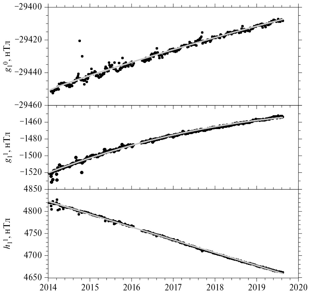 Коэффициенты любой сферической гармоники можно нанести на график как функцию даты. На рис. 2 показан пример такого графика. Точки, для которых было заполнено менее 90% всех ячеек, отбрасывались и в дальнейшем анализе не участвовали. Выбросы имеют несколько причин. Первая — ошибки в исходных данных SWARM. Предварительный отбор данных делался, но удалить все ошибки в таких больших массивах данных сложно. Вторая — вариации магнитного поля и, соответственно, получаемых моделей, связанные с изменением внешних и ионосферных источников. При построении модели использовались данные только спокойных интервалов, но какие-то возмущения могли оставаться и в такие моменты. Третья и, мы считаем, основная причина — неравномерное распределение данных по поверхности земного шара. Практически всегда в данных имеются более или менее длительные пропуски или данные исключались согласно описанным выше критериям, что приводило к отсутствию данных для отдельных регионов и изменению модели.