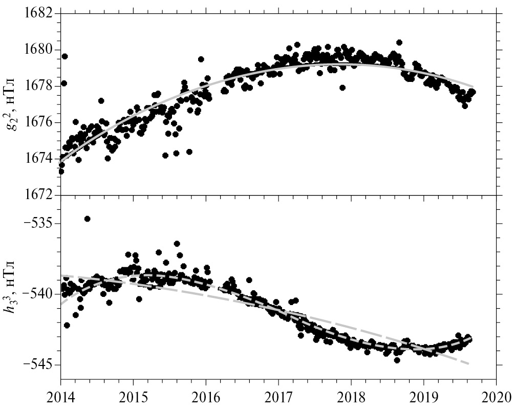 Соответственно, использование разных методов аппроксимации даже при интерполяции на 4 месяца вперед может дать различные значения. Например, для показанной на рис. 3 гармоники различные методы аппроксимации при экстраполяции даже на 3 месяца дают результаты от –546 до –542 нТл. Для получения модели на 01.01.2020 г. мы решили использовать данные только за последние 2 года. Значения коэффициентов рассчитывались как параболически-экстраполированные данные за интервал 01.09.2017 г. — 31.08.2019 г. Для каждой сферической гармоники использовалась трехпроходная параболическая аппроксимация данных. После первой аппроксимации точки с отклонением более двух стандартных отклонений от полученной параболы были исключены, и следующая аппроксимация производилась на основе оставшихся данных. Эту процедуру повторяли 3 раза. На рис. 4 показаны все имеющиеся точки, но точки выше и ниже пунктирных линий в процессе аппроксимации были исключены, и окончательно парабола подбиралась только по точкам между пунктирными линиями.