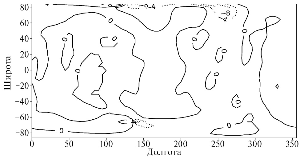 Рис. 6. Изолинии распределения разности D-компонент, рассчитанной по модели ИЗМИРАН и IGRF.