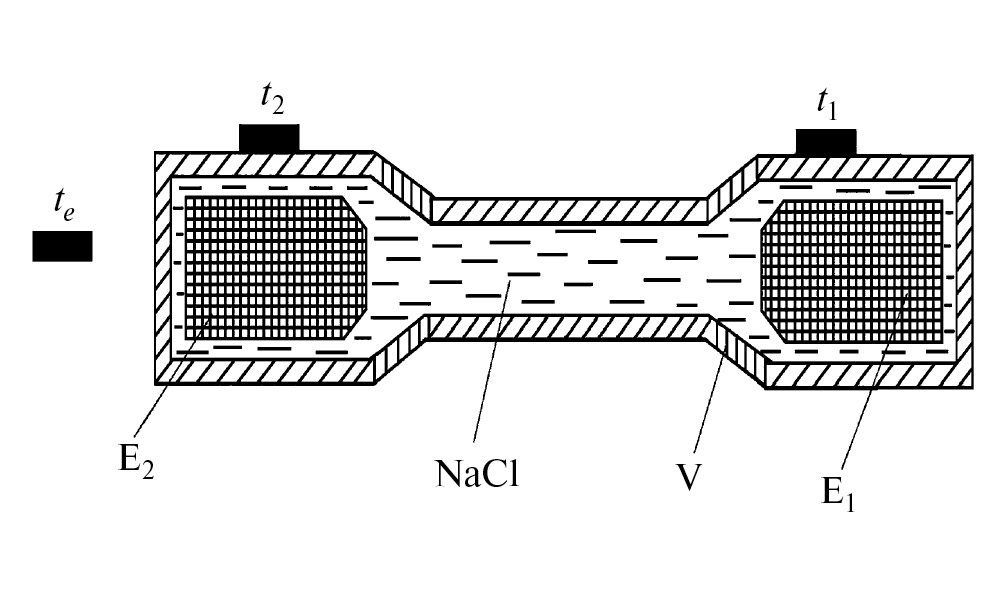 Рис. 1. Схема устройства детектора [Korotaev et al., 2019]: Е — электроды (сложное внутреннее устройство не показано), разность потенциалов которых (U) является сигналом детектора; NaCl — электролит (3% водный раствор); V — корпус детектора (эбонит); t1,t2.te — термодатчики. Расстояние между электродами — 30 см.