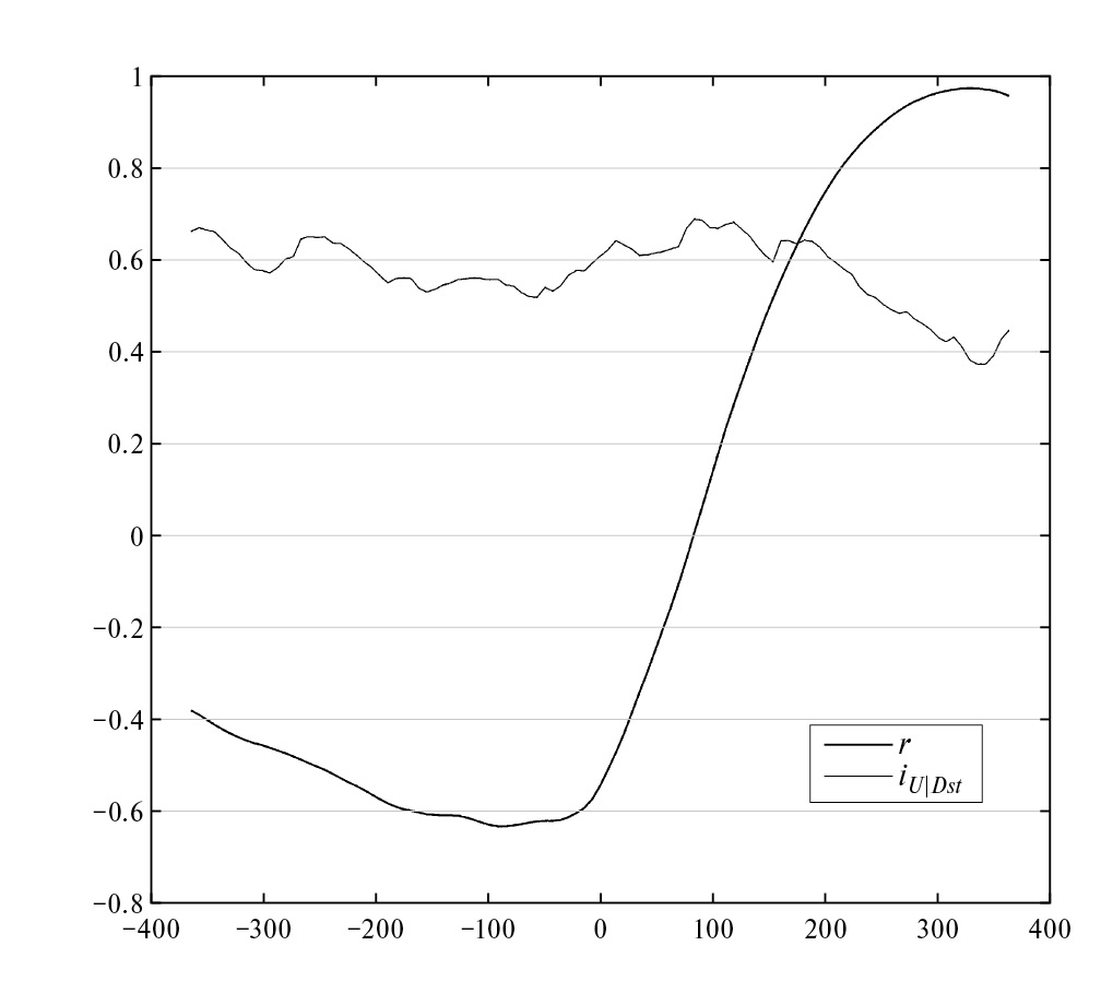 По фильтрованным данным в диапазоне сдвигов времени −365 < τ < +365 сут рассчитывалась корреляционная функция U и Dst и функция независимости U от Dst. Последняя определяется через условную и безусловную шенноновские энтропии переменных: , она ведет себя, грубо говоря, обратно модулю корреляции, но, в отличие от нее, адекватна при любой нелинейности связи переменных. Результаты расчета показаны на рис. 2. Глобальный максимум корреляции при опережении U относительно Dst на 329 сут. Ему соответствует глобальный минимум независимости .