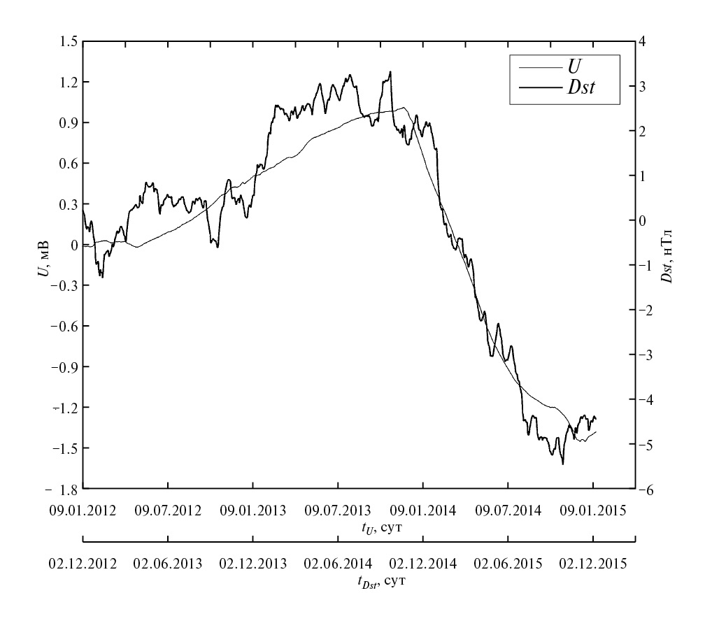 Рис. 3. Демонстрация возможности прогноза по U путем сдвига фильтрованных рядов на величину опережения глобального максимума корреляции (329 сут). Верхняя ось времени соответствует U, нижняя — Dst.