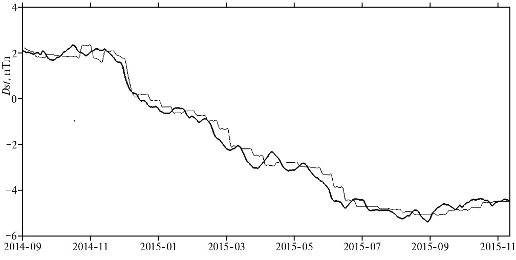 Рис. 6. Прогноз Dst методом текущей нейросети с фиксированной заблаговременностью 329 сут (тонкая линия) в сопоставлении с фактической кривой (жирная линия). Среднеквадратичная погрешность прогноза — 0.29 нТл.