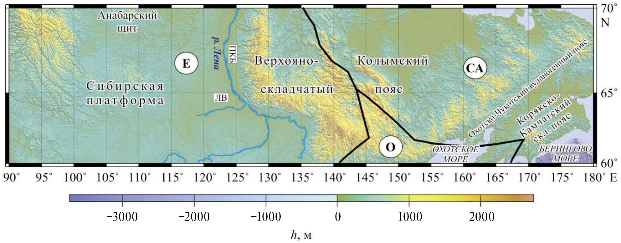 Рис. 1. Область исследования. Границы литосферных плит (черные кривые) приведены согласно [Bird, 2003]. Литосферные плиты (буквы в кружках): Е — Евразийская, О — Охотоморская, СА — Северо-Американская. Топография и батиметрия (h — высота над уровнем моря) показаны в соответствии с глобальной моделью ETOPO 2022 [NOAA…, 2022], ЛВ — Линденская впадина, ПКБ — Предверхоянский краевой прогиб.