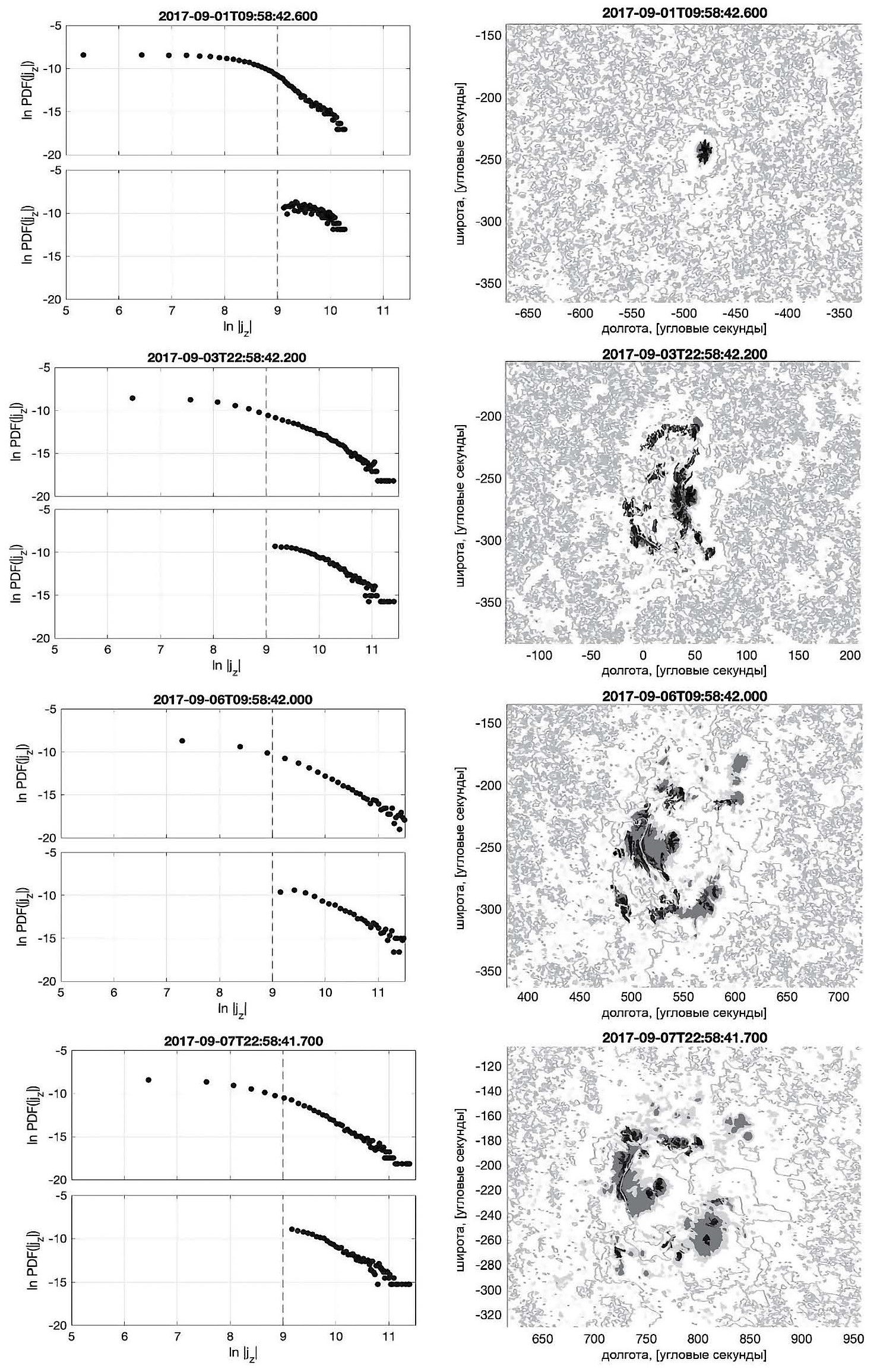 На левых панелях рис. 4—6 можно видеть характер изменения PDF(|jz|) с ходом эволюции АО, а именно появление степенного “хвоста” и уменьшение его наклона (уменьшение абсолютного значения индекса степени) в процессе возрастания магнитного потока, что подтверждает формирование в АО большего количества участков с сильными токами на этих этапах. Для каждого момента времени приведены два распределения PDF(|jz|): верхнее — для всей рассматриваемой АО, нижнее — только для обозначенных островов сильных токов.