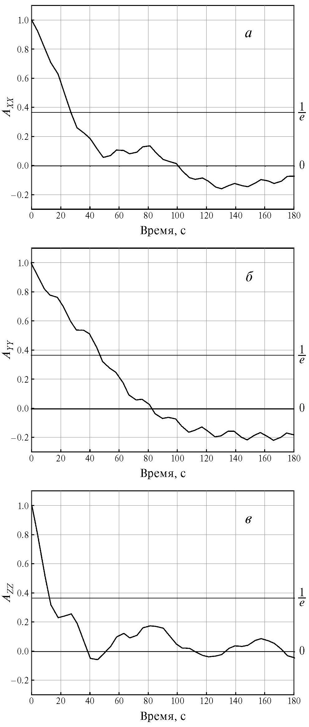 Рис. 2. Примеры автокорреляционных функций компонент скорости плазмы для интервала 0:20—0:32 UT 28.05.2017 по данным MMS1: (а) — AXX, (б) — AYY, (в) — AZZ.
