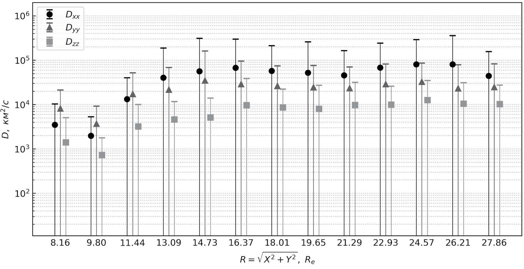 Для радиальных профилей компонент вихревой диффузии (см. рис. 3—6) характерно увеличение значений коэффициентов с ростом геоцентрического расстояния до ~14RE с последующим выходом на плато. Данная закономерность подтверждает выводы работ о проецировании аврорального овала на внешнюю часть кольцевого тока, а не на собственно плазменный слой, где постоянно высок уровень турбулентности. Как известно, на широтах аврорального овала в магнитоспокойных условиях могут наблюдаться почти стационарные вихри, приводящие к формированию авроральных структур типа перевернутого V [Antonova and Ovchinnikov, 1998] и стабильные авроральные дуги. В целом закономерность близка к результатам [Stepanova et al., 2009, 2011; Pinto et al., 2011], но получена на большей статистике.