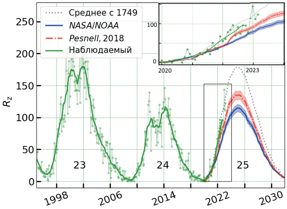 Из-за наблюдаемого ослабления солнечной активности в течение последних двух циклов (23 и 24-го), прогнозу 25-го солнечного цикла в настоящее время уделено большое внимание. При сохранении этой тенденции 25-й цикл предположительно мог бы оказаться еще слабее. Однако есть и другой вариант. Некоторые недавние исследования показывают, что эта тенденция к ослаблению прервется, и предстоящий солнечный цикл будет сильнее, чем 24-й цикл [Sarp et al., 2018; Li et al., 2018; Ишков, 2020, 2022].