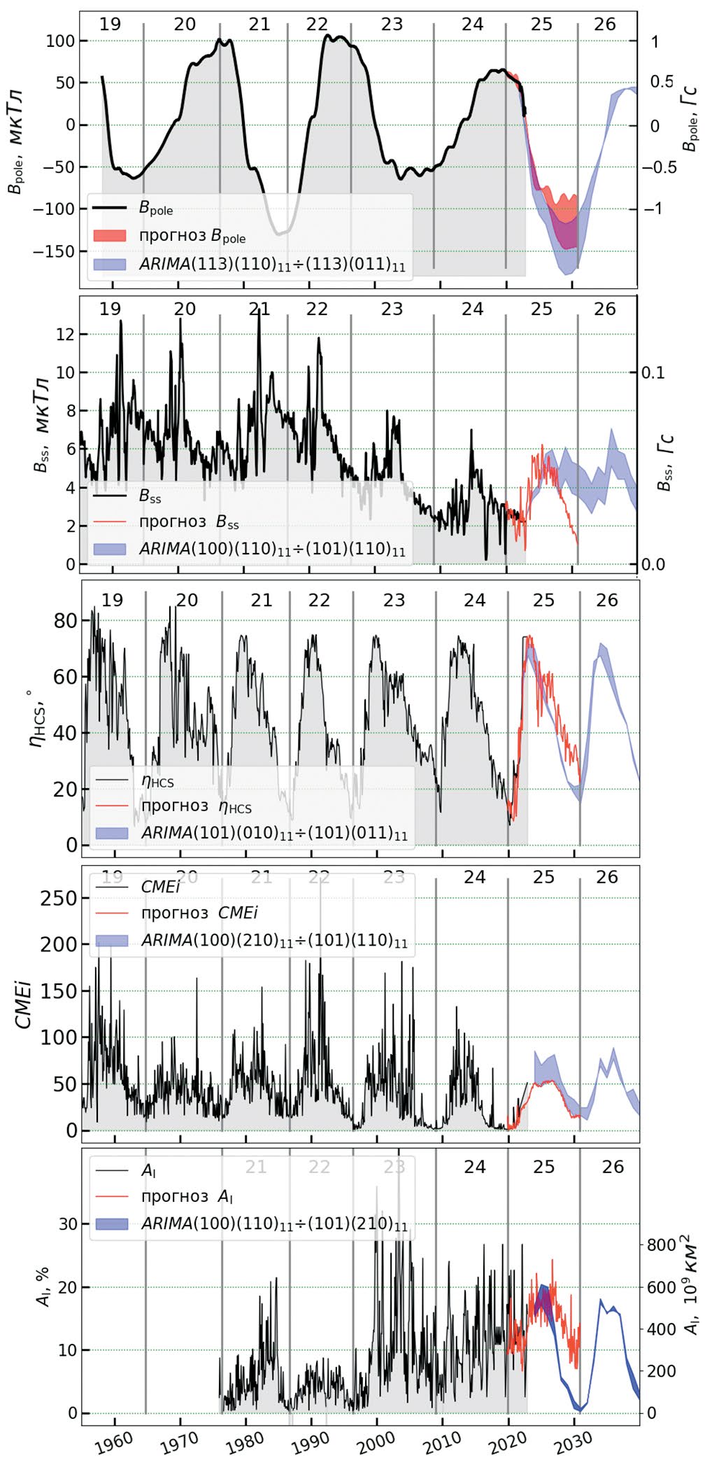 Результат приведен на рис. 3 для пяти экспериментально измеренных и прогнозируемых параметров. При прогнозировании из возможных вариантов прогноза отбирались минимальный и максимальный, после чего формировался доверительный интервал. Например (верхняя панель рис. 3), при прогнозировании с помощью модели ARIMA полярного поля Солнца Bpole был выполнен отбор решений ARIMA(1,1,3)(1,1,0)22 и ARIMA(1,1,3)(0,1,1)22 с минимальным порядком авторегрессионной модели, интегрирования и скользящего среднего с указанием сезонности в виде нижнего индекса [Bajaj, 2023; Rob et al., 2014]. Видно, что для параметров Bpole, Bss, ηHCS и CMEi-индекса два независимых метода прогнозирования дают хорошее согласие, менее однозначны прогнозы площади приэкваториальных корональных дыр Al.