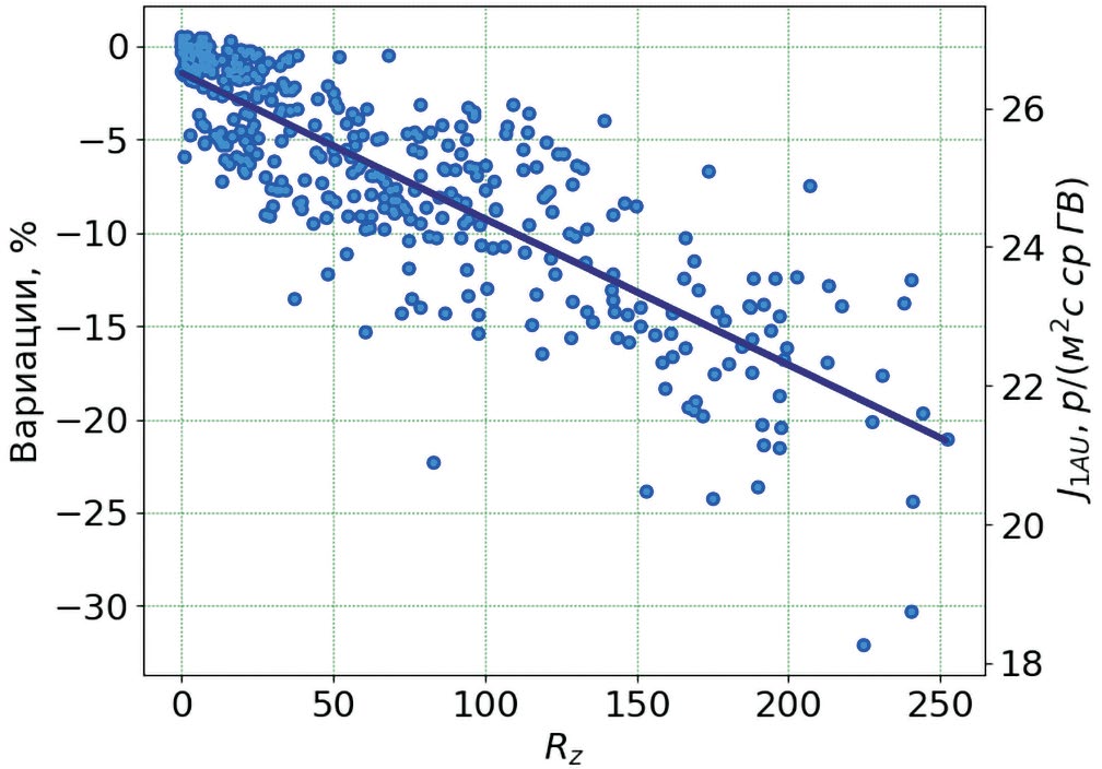 Здесь JLIS =33.2 (м2 с ср ГВ)–1 интенсивность 10 ГВ частиц на границе гелиосферы, Δ = –0.19 остаточная модуляция галактических космических лучей в гелиосфере относительно базового периода, а ak — коэффициенты регрессии. Полученная зависимость интенсивности от числа пятен Rz также приведена на рис. 4 (правая шкала).