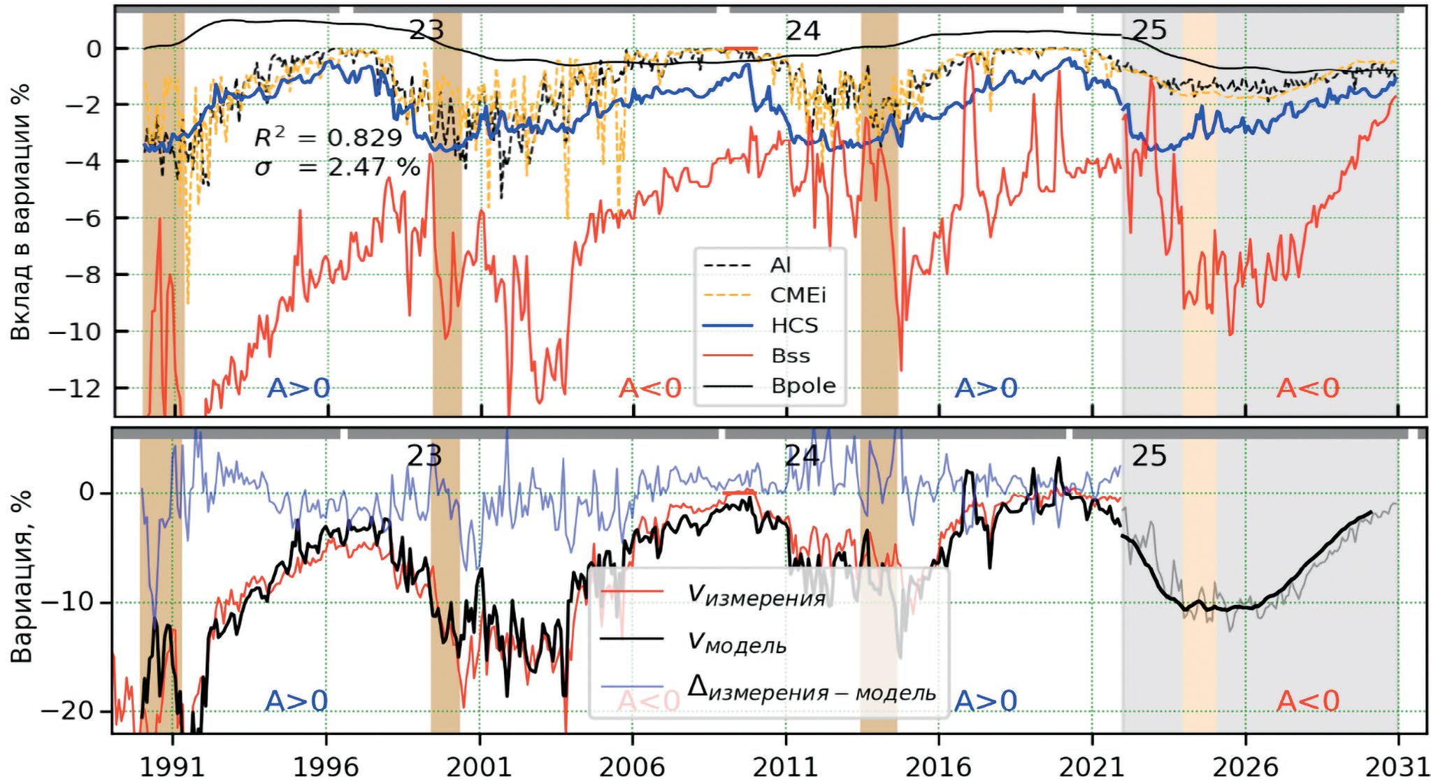 Рис. 5. Вклад в вариацию космических лучей различных параметров солнечной активности многопараметрической модели вариаций (верхняя панель) и долговременной ход наблюдаемой и моделируемой вариации и их невязка (нижняя панель). В левой части каждой панели показаны вычисленные величины, в правой части — прогнозируемые величины вклада различных факторов для 25-го цикла СА (серая заливка).