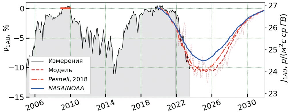 Для геофизических и астрофизических задач важно знать изменения интенсивности космических лучей J1AU, которые связаны с вариациями космических лучей v на орбите Земли [Янке и др., 2023] как