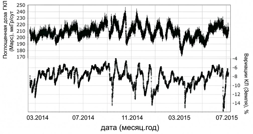 Рис. 2. Вариации поглощенной дозы ГКЛ по данным детектора RAD на Марсе и вариации КЛ по данным сети наземных станций НМ за период март 2014 г. — июль 2015 г.