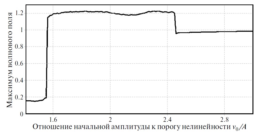 Рис. 2. Зависимость максимума волнового поля от отношения начальной амплитуды к величине порога нелинейности.