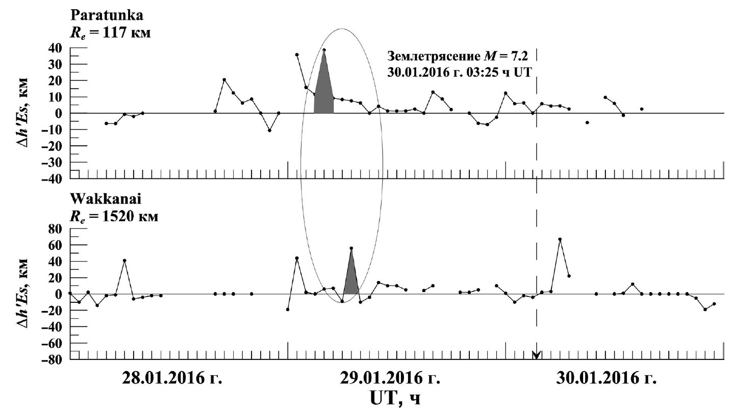 Рис. 1. Часовые вариации ∆hʹEs (сплошные линии с точками) на ст. Paratunka (верхняя панель) и ст. Wakkanai (нижняя панель) перед землетрясением 30.01.2016 г. с промежуточной глубиной очага hG = 161 км и магнитудой M = 7.2. Разрывы линий означают отсутствие данных. Вероятные КИПЗ отмечены темной заливкой и выделены эллипсом. Эпицентральные расстояния (Re) до соответствующей ионосферной станции указаны на рисунке под названиями станций.
