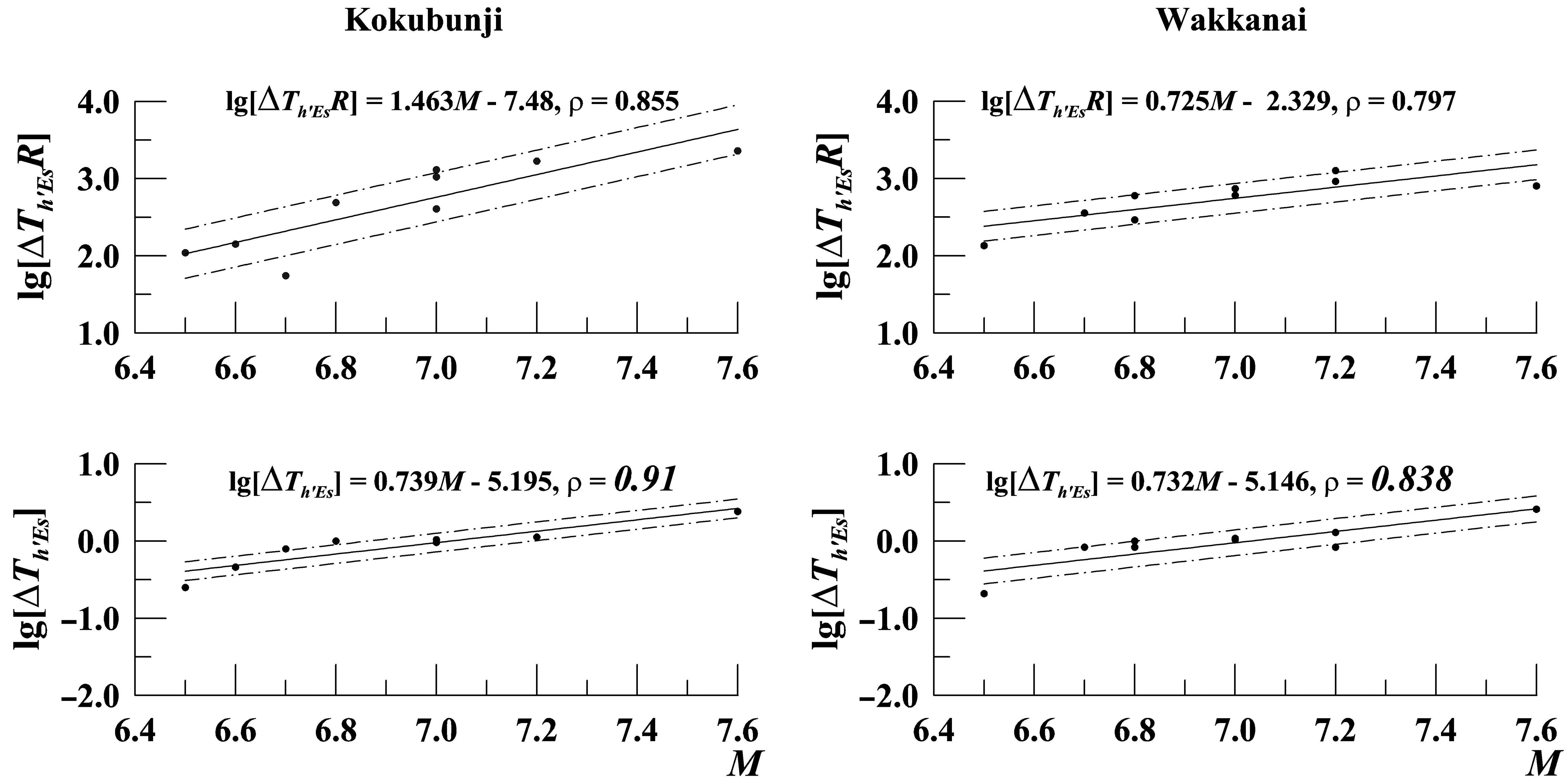 Рис. 2. Зависимости логарифмов величин ΔTh'Es (сут) и логарифмов произведений ΔTh'Es×R (R – эпицентральное расстояние до ионосферной станции в км) для возможных KИПЗ, наблюдаемых на ст. Kokubunji (левые панели) и ст. Wakkanai (правые панели) от магнитуд (M) рассмотренных промежуточных землетрясений, построенные по данным этих станций (точки). Сплошными линиями показаны линии регрессии, полученные методом наименьших квадратов, а штрихпунктирными линиями указаны величины стандартных ошибок этих регрессий (разброс зависимой переменной вокруг линии регрессии). Рядом с уравнением каждой регрессии указан коэффициент корреляции (ρ).
