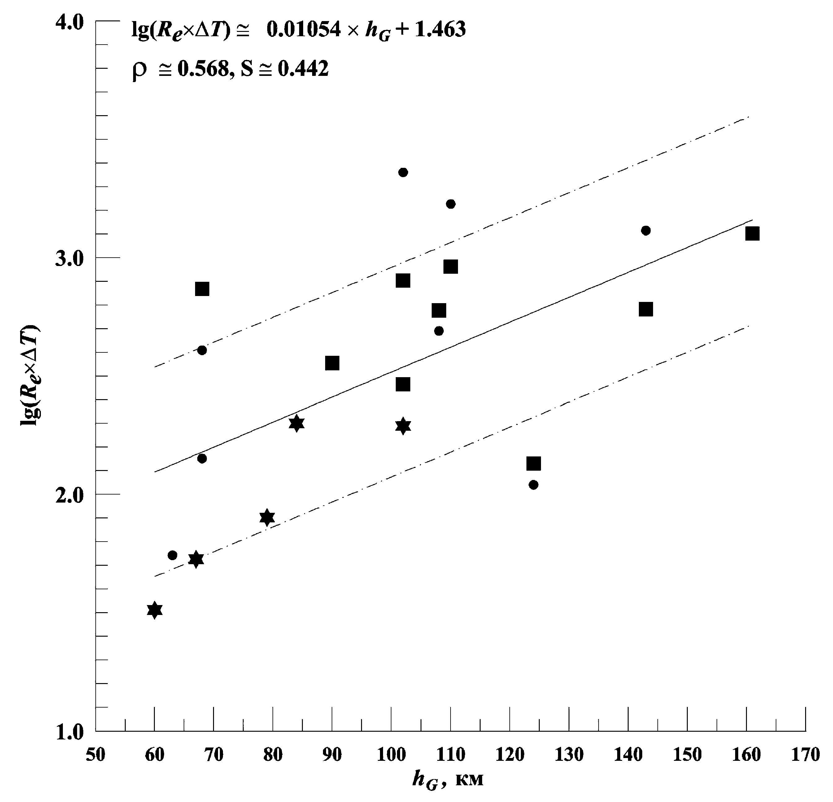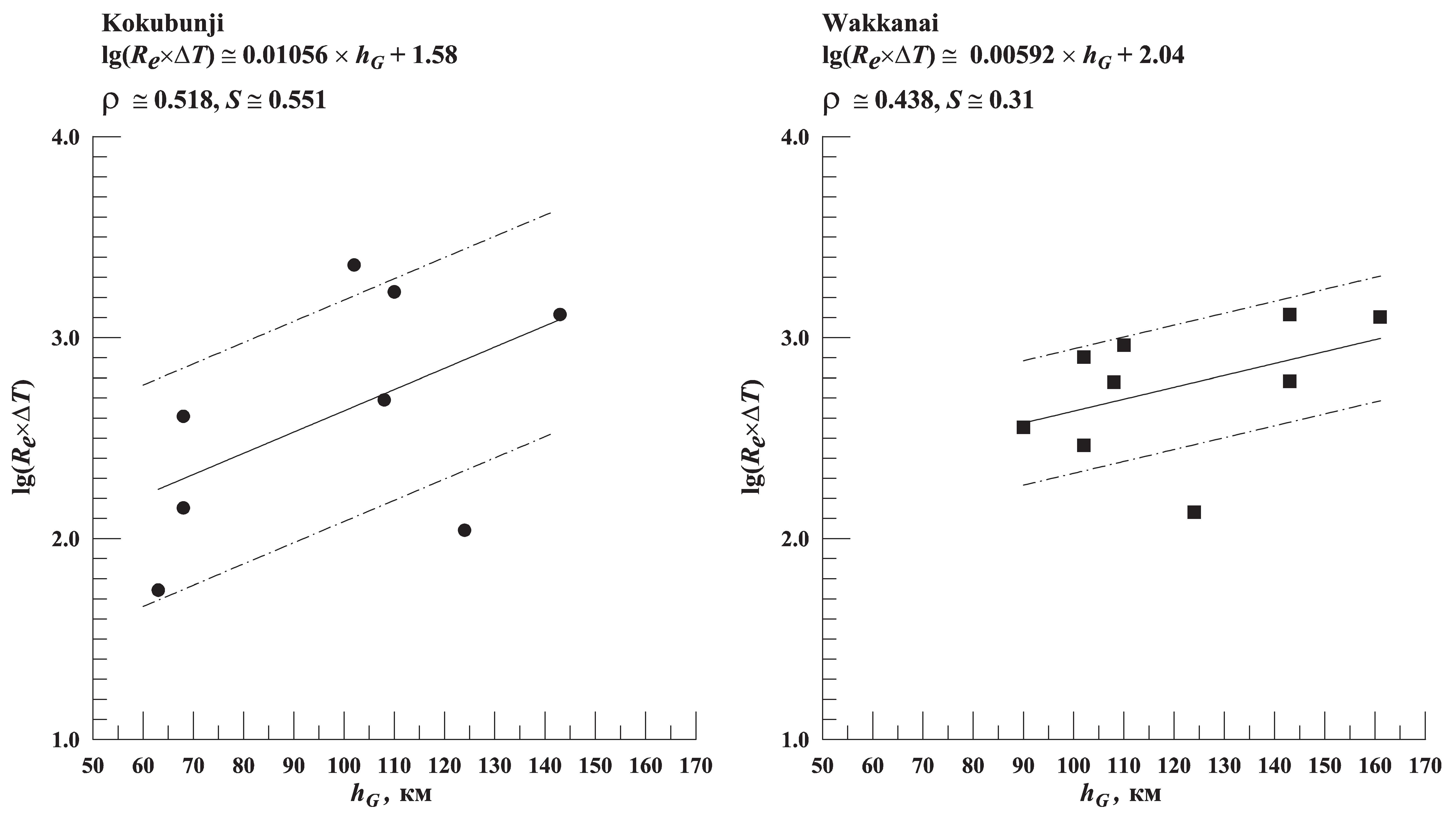 Как видно из рисунка, увеличение массива данных привело к существенному увеличению коэффициента корреляции, что видно из сравнения ρWakkanai ≅ 0.438 < ρKokubunji ≅ 0.518 < ρ ≅ 0.568, таким образом, теснота связи между lg(ΔT∙Re) и hG по шкале Чеддока выросла от умеренной (0.3 < ρ < 0.5) до заметной (0.5 < ρ < 0.7), что свидетельствует в пользу большей надежности выявленной тенденции.