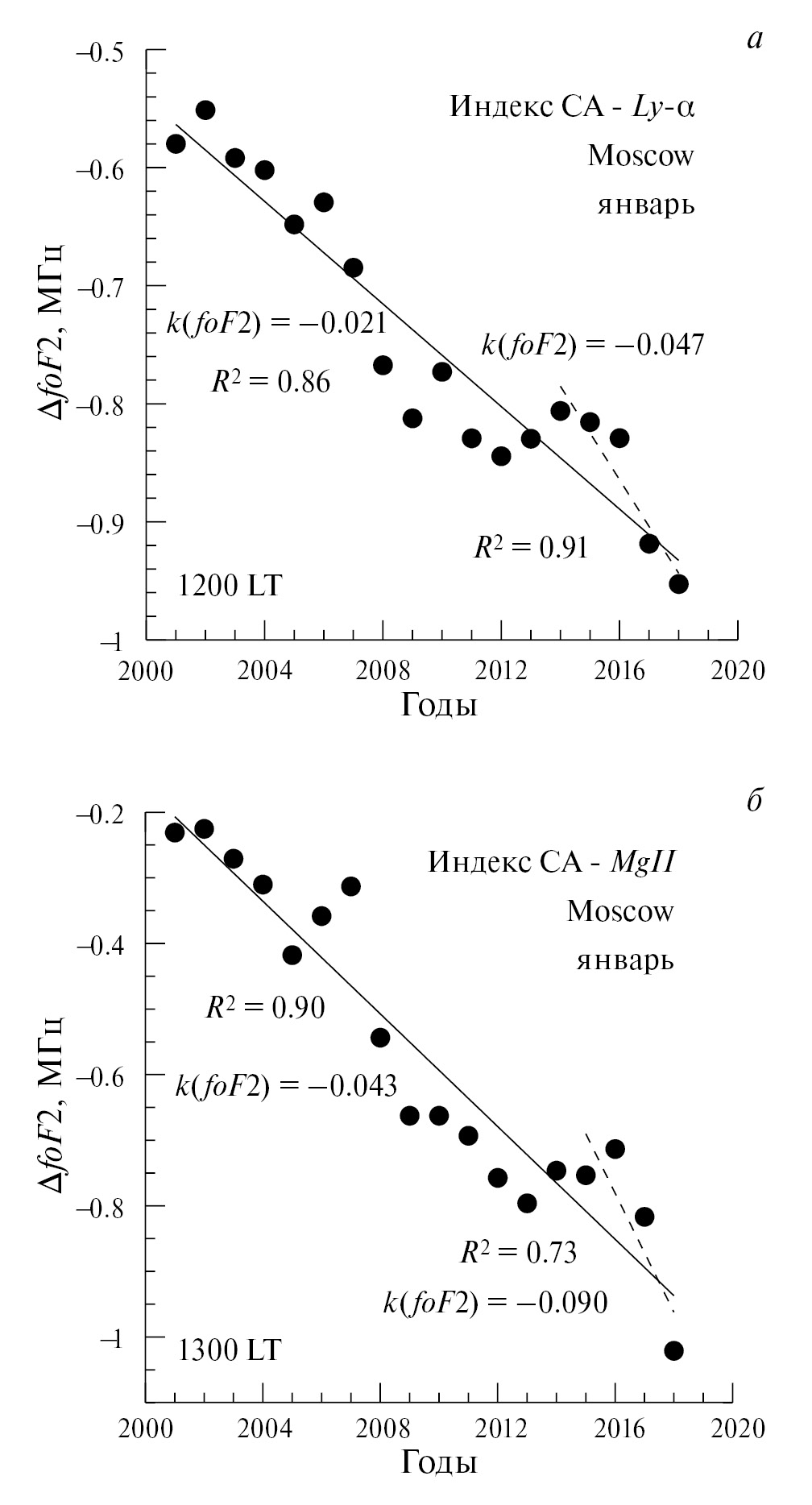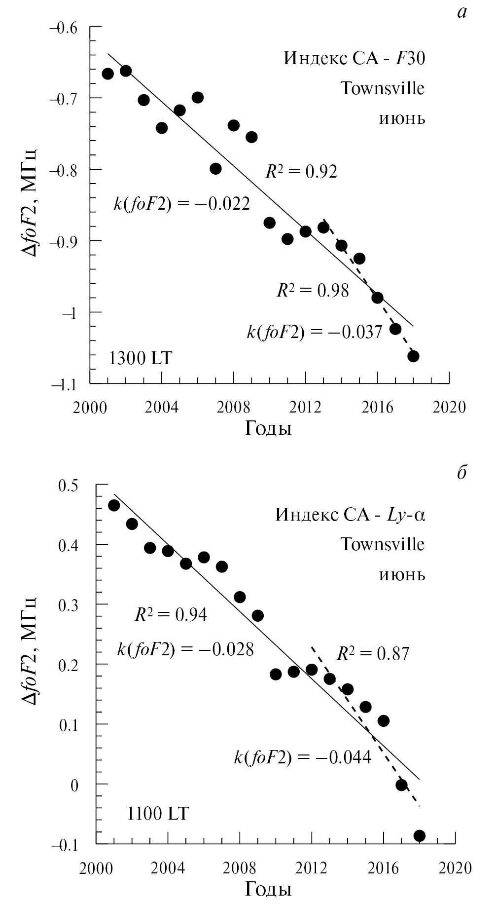 При определении трендов ионосферных параметров очень важен вопрос о выборе индексов солнечной активности (СА) для устранения эффектов СА. Вопрос обсуждался многими исследователями. Отметим здесь лишь две работы аргентинской группы [De Haro Barbás and Elias, 2020; De Haro Barbás et al., 2021] и публикации Laštovička [2022] и Laštovička and Burešová [2023].
