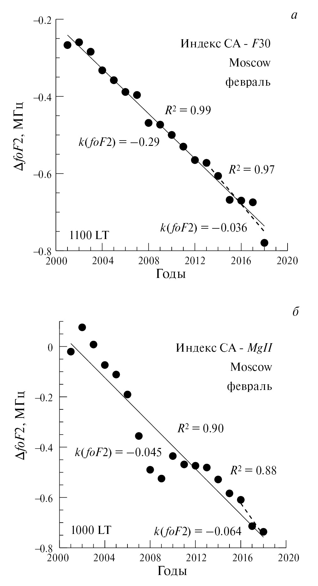 По графику зависимости ΔfoF2 от времени для каждой ситуации (станция, месяц, индекс СА) строилась соответствующая таблица с полученными параметрами. Чтобы не перегружать статью таблицами, мы приводим в табл. 1 в качестве примера результаты только для двух ситуаций. В этой таблице для каждой ситуации приводится тренд k(foF2) для всех пяти моментов LT для всего анализируемого периода 1996–2023 гг. с соответствующими величинами R2, а также тренд для недавних лет также c величинами R2.