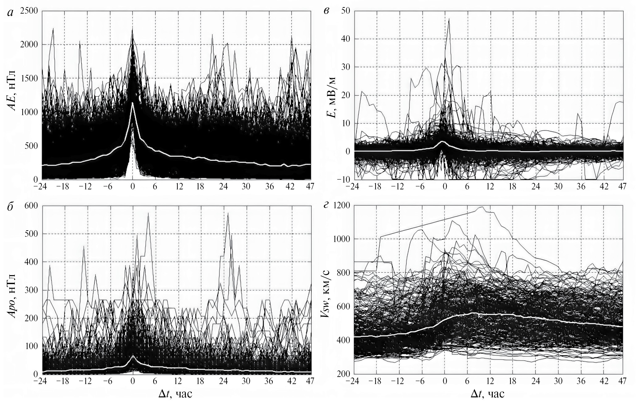 Рис. 2. Профили интенсивных бурь за 1995−2017 гг., центрированные к моменту пика АЕ-индекса: (а) профили AE(t); (б) Apo(t); (в) E(t); (г) Vsw(t). Индивидуальные профили − черные линии, медиана − белая кривая.