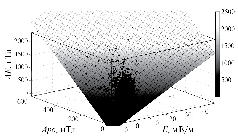 Выражения (2−3) включают все точки профилей бурь. При наличии данных межпланетного электрического поля профиль бурь AE-индекса можно представить в зависимости от двух параметров: E и Apo. Такая двухпараметрическая зависимость представлена на рис. 4 и в уравнении (4):